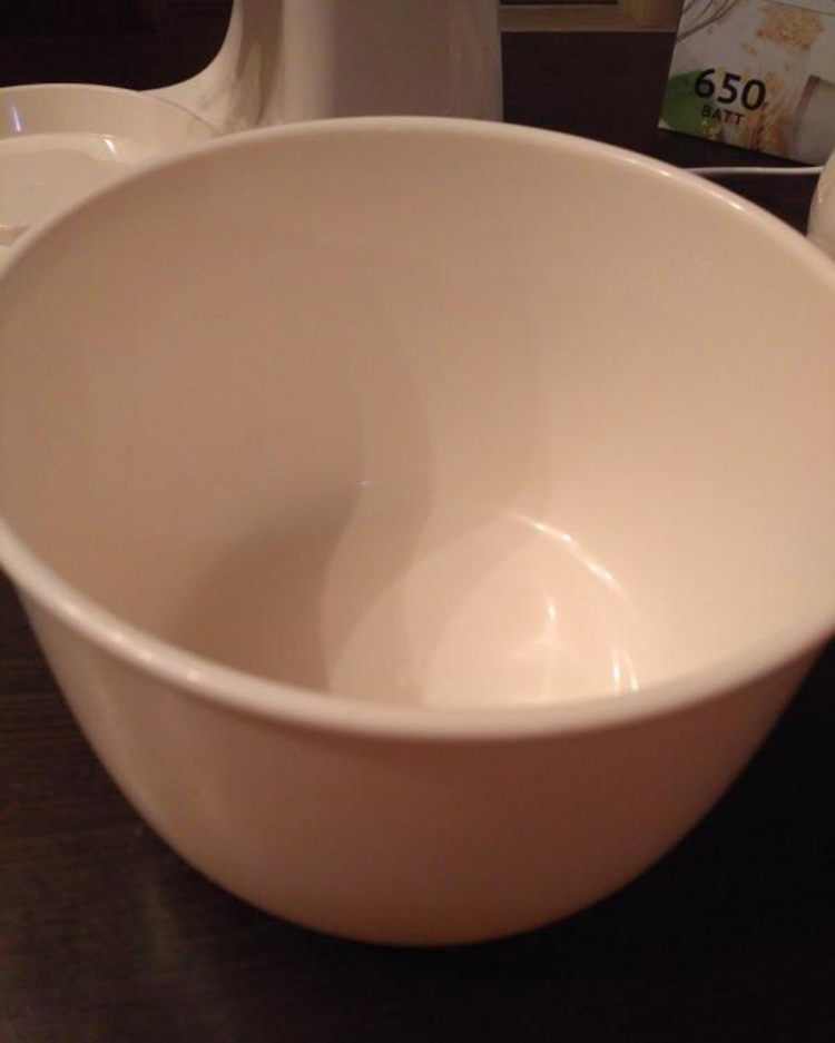 The volume of the bowl is small, it is designed for a small amount of products. If you are planning to beat, for example, 6 eggs, it is better to do it in manual mode. With so many liquid ingredients, the bowl starts spinning rapidly and the products spill over.