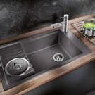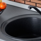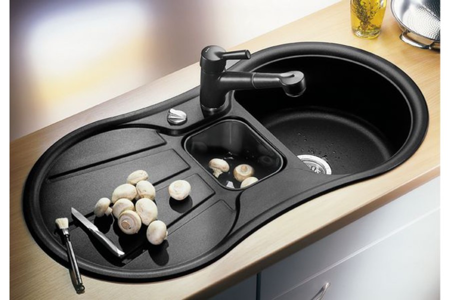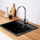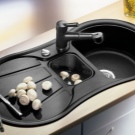 - Sinks produced in different shapes and shades. Each buyer can choose the option in accordance with the color prevailing in the interior of the kitchen. Look beautiful models that are installed in the countertop. The product, matched in shade, looks harmoniously against the background of a kitchen set. Especially popular are black car washes, which are most often used in the creation of modern interiors in the style of minimalism.