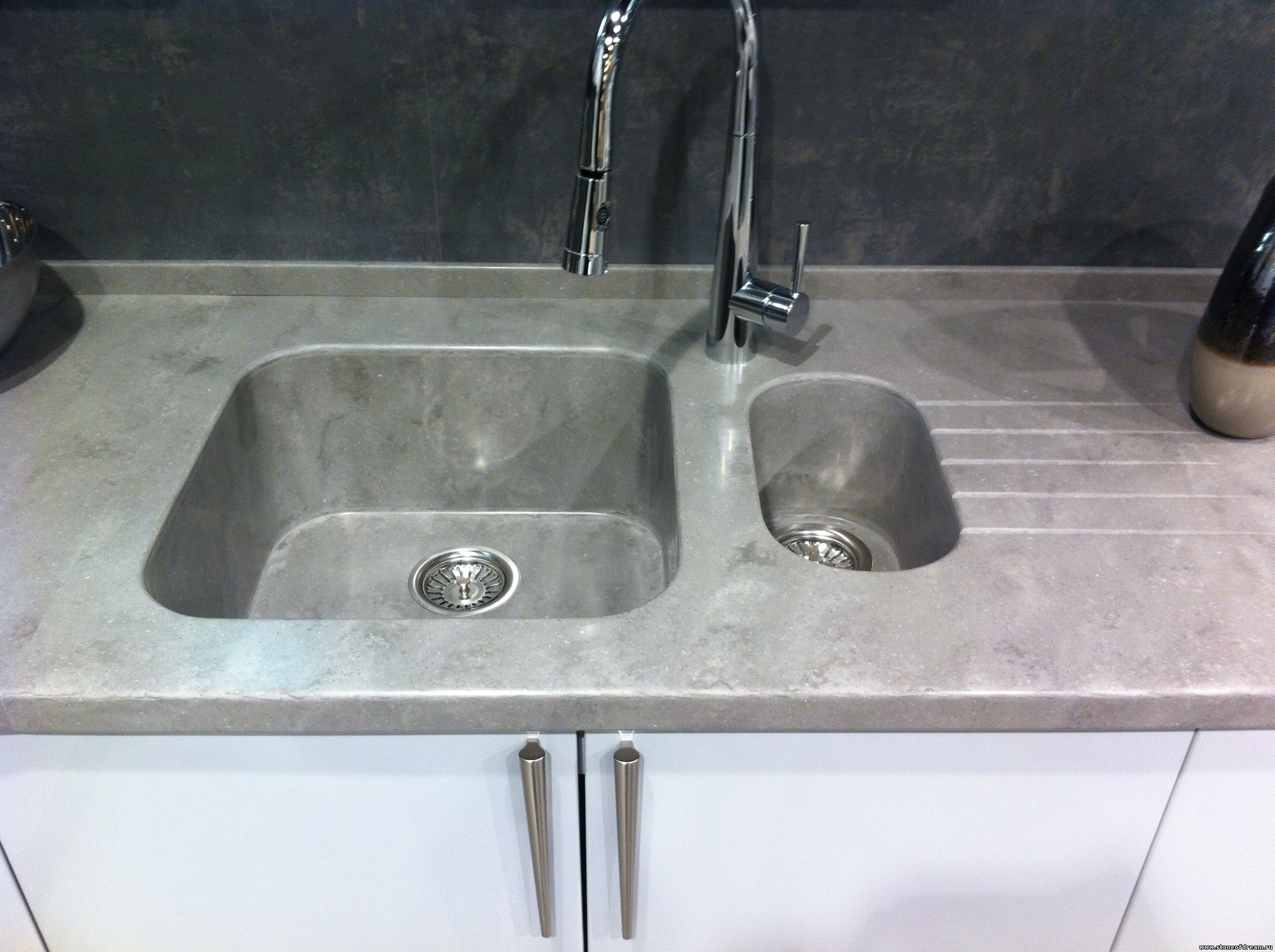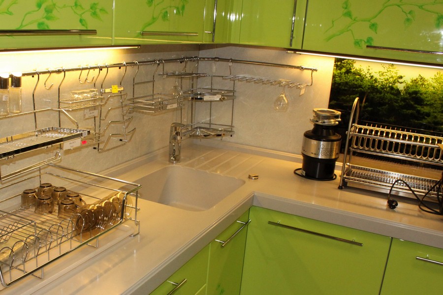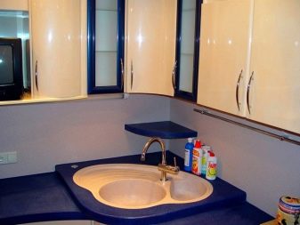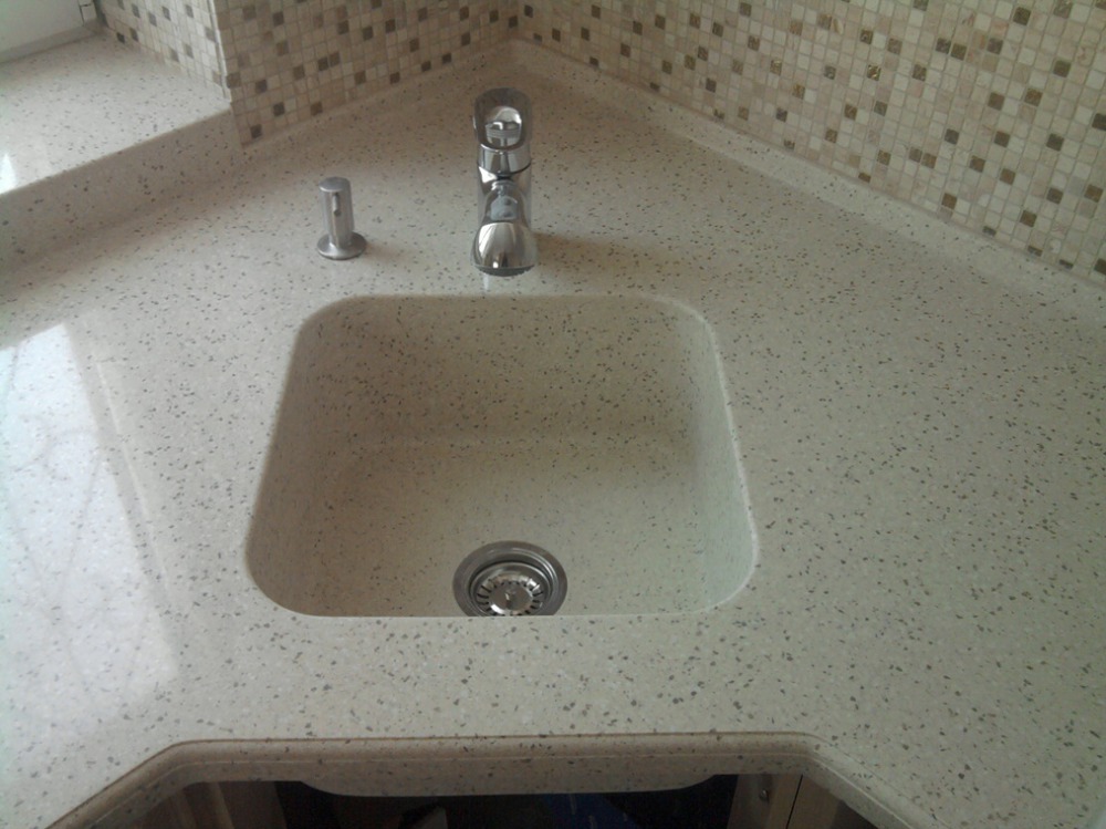 - From Corian. The stone has no pores, has water-repellent properties and is not contaminated even after prolonged use. Corian shells are excellent for cleaning. The material does not differ whimsical care and retains its original appearance for quite a long time.