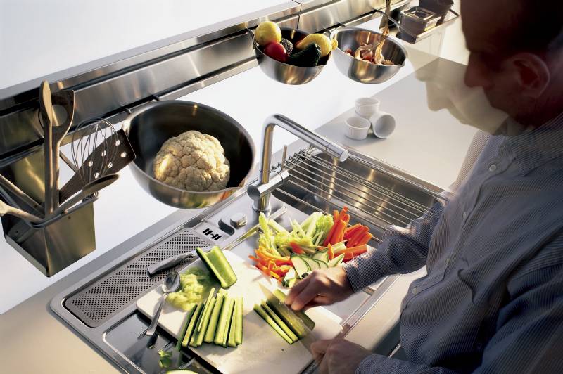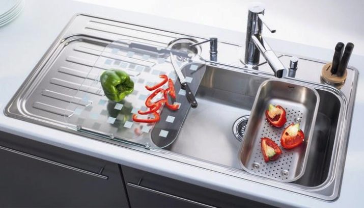 For the convenience of consumers, the company's specialists have developed a number of additional accessories that can be included with some models.For example, some instances are equipped with built-in valve, valve and hidden overflow. There are also models that have a bio waste compartment, a removable drying bowl for cutlery, a cutting board, and even a stand for knives.