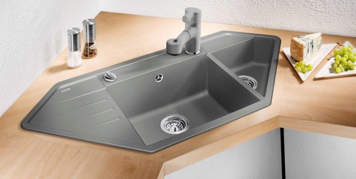 Corner sinks are products of non-standard configuration. Their shape is most often trapezoidal, but the cup itself is round. They are convenient for installation in the corner cabinet of the headset, but it is necessary to carefully examine and compare all the dimensions in order to make the right choice.