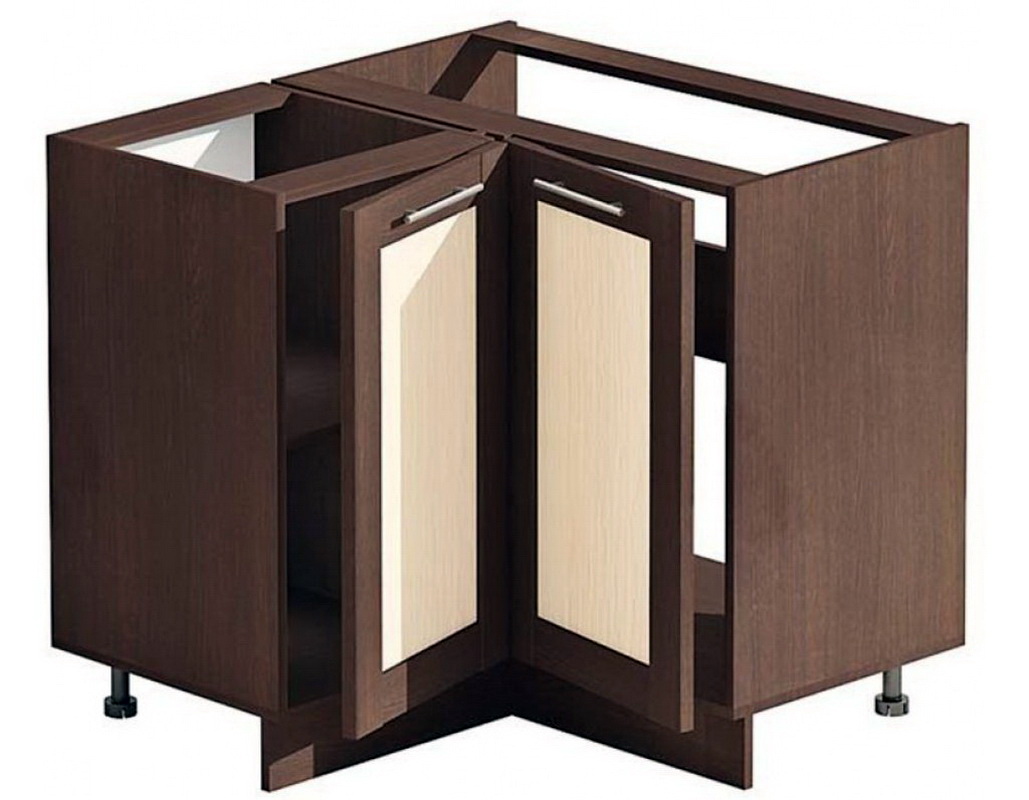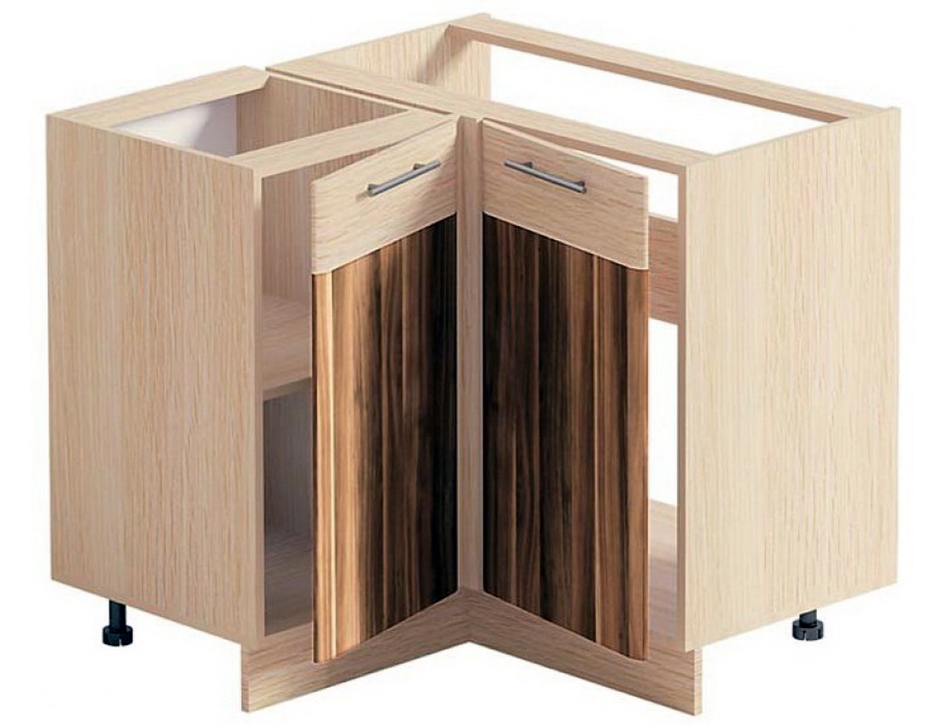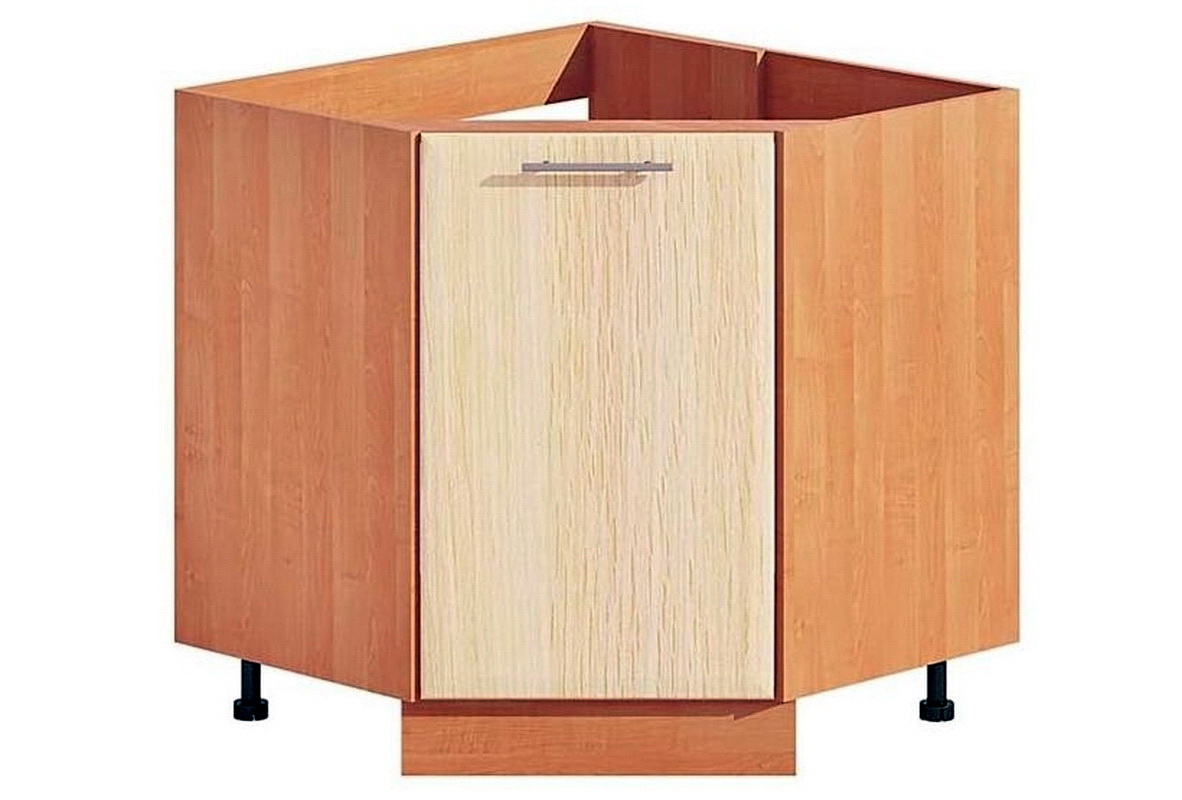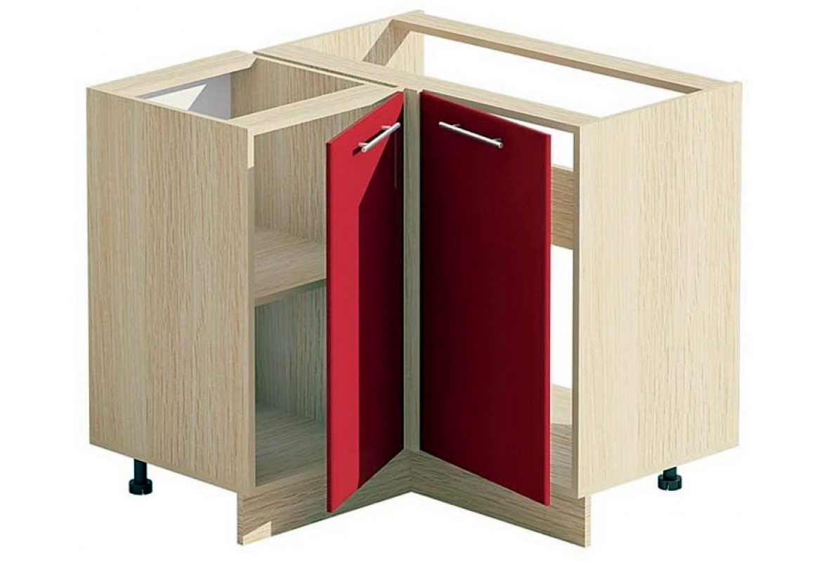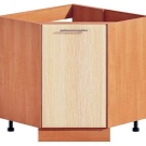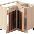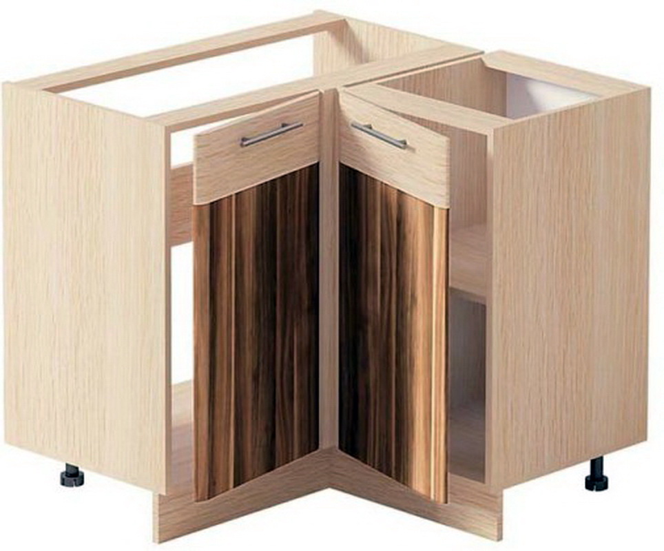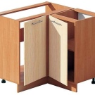 - The cabinet is equipped with an outer wall 520 mm long, while the inner side reaches only 450 mm. The bottom of the module is in the form of an irregular hexagon. A feature of this design is the absence of the back wall and shelves.