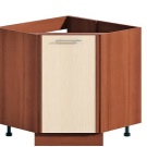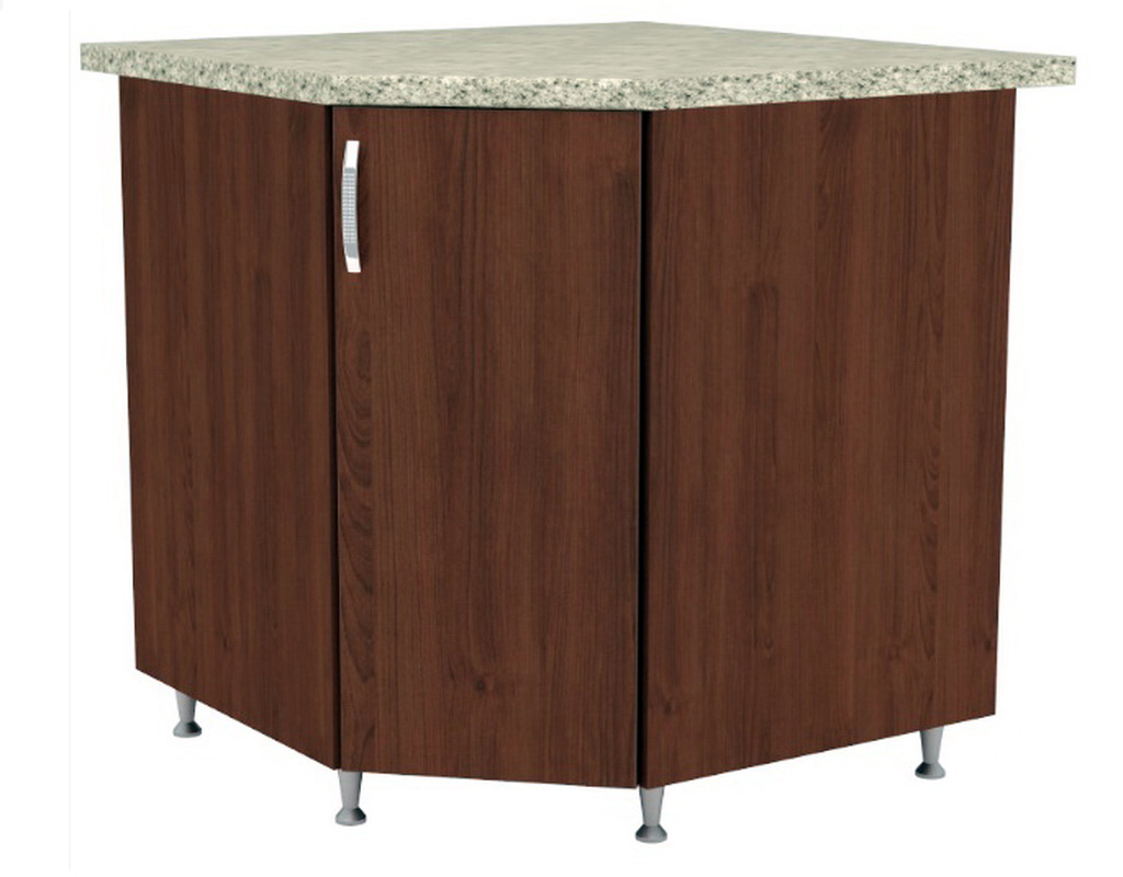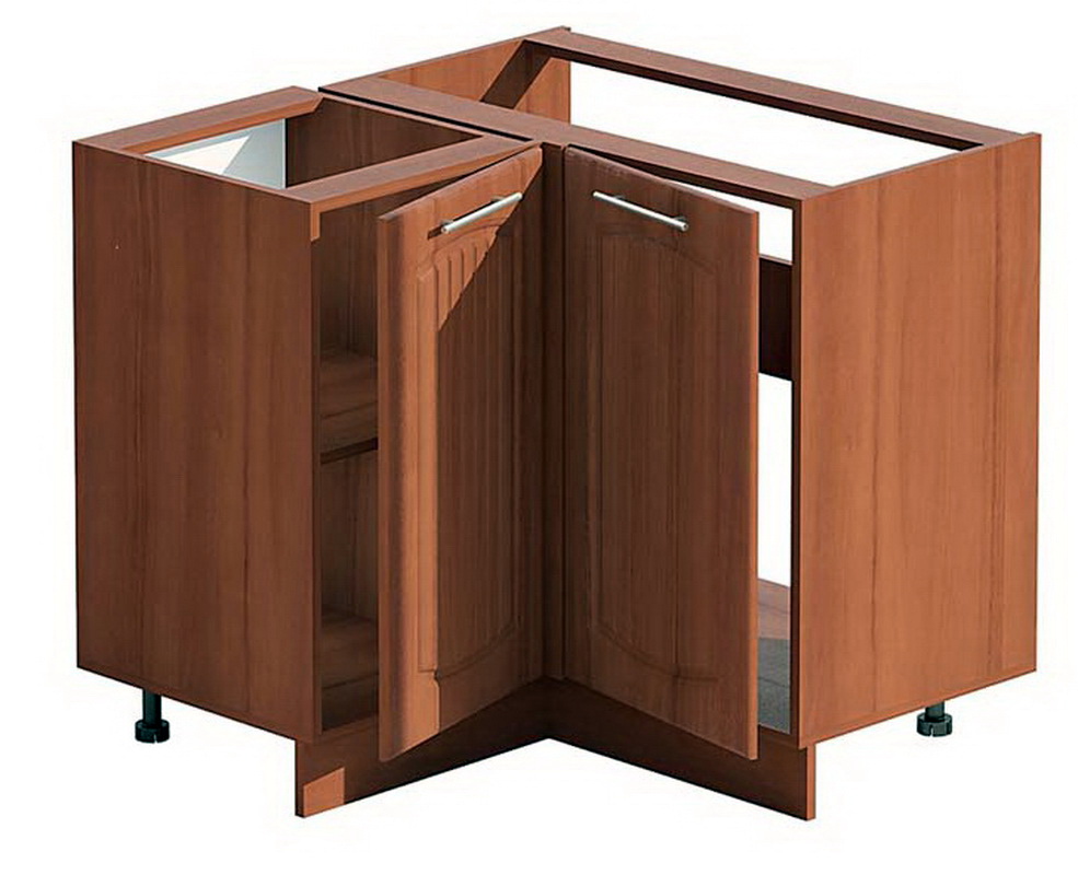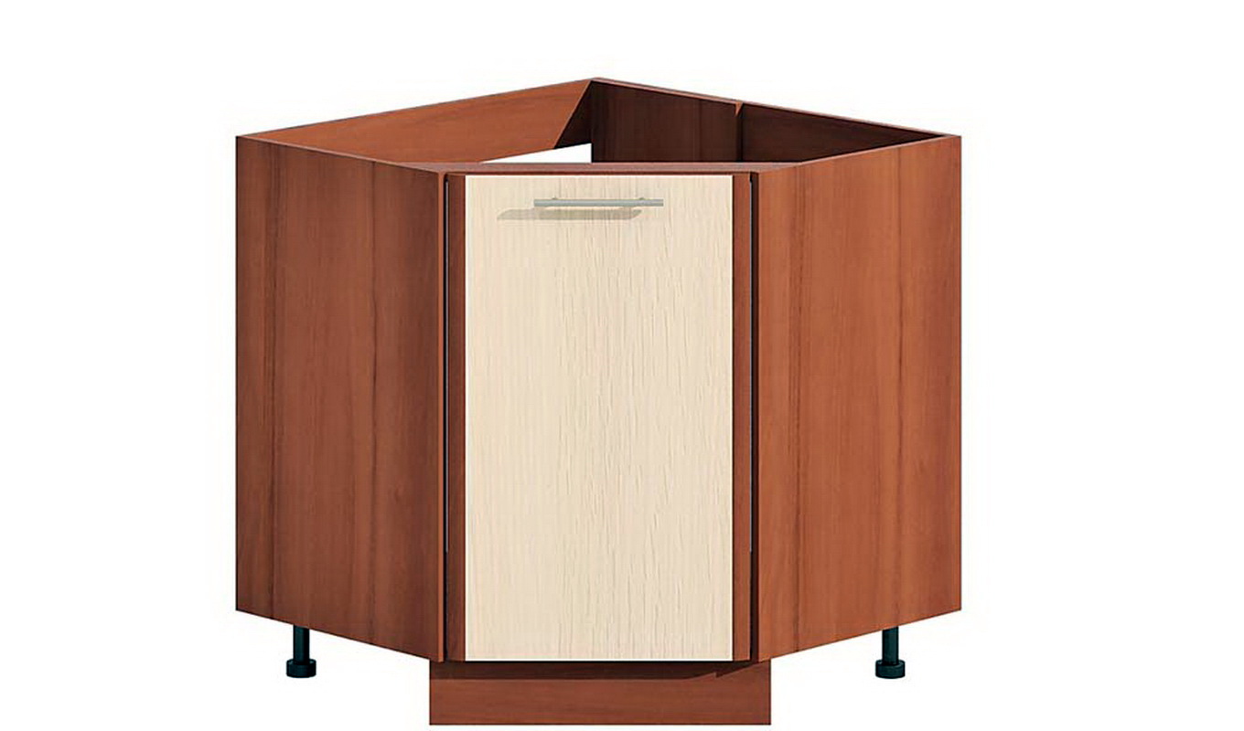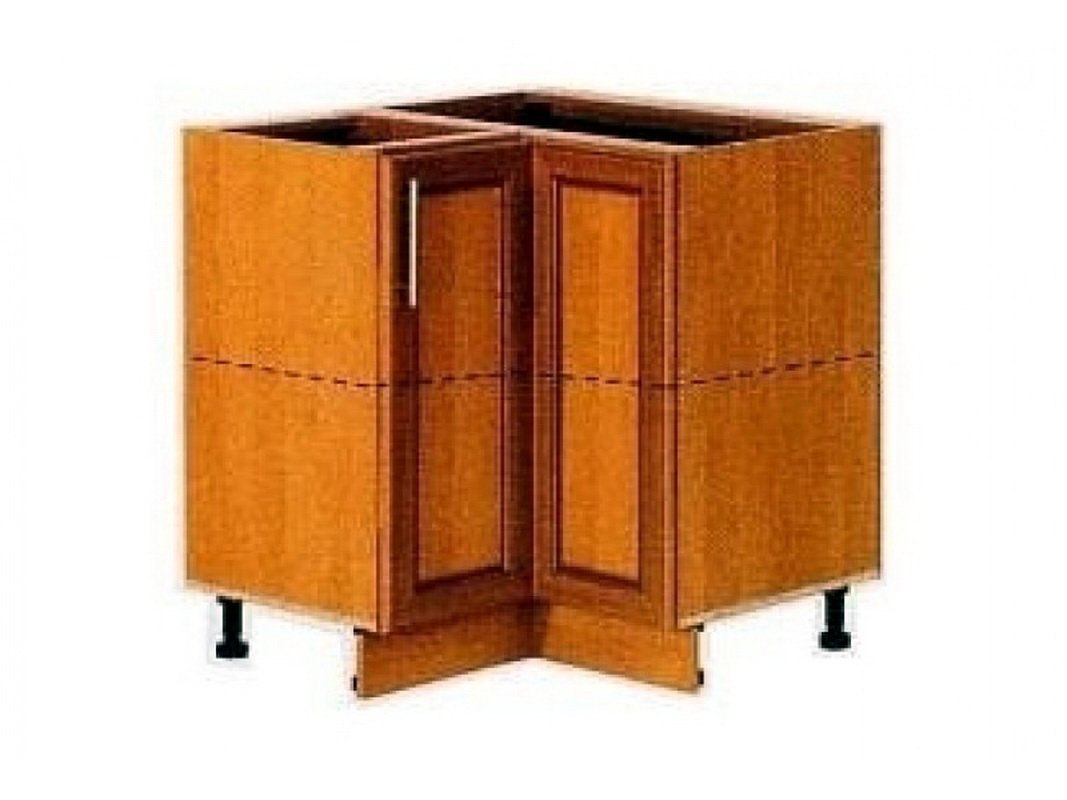 - The cabinet is equipped with an outer wall 520 mm long, while the inner side reaches only 450 mm. The bottom of the module is in the form of an irregular hexagon. A feature of this design is the absence of the back wall and shelves.