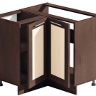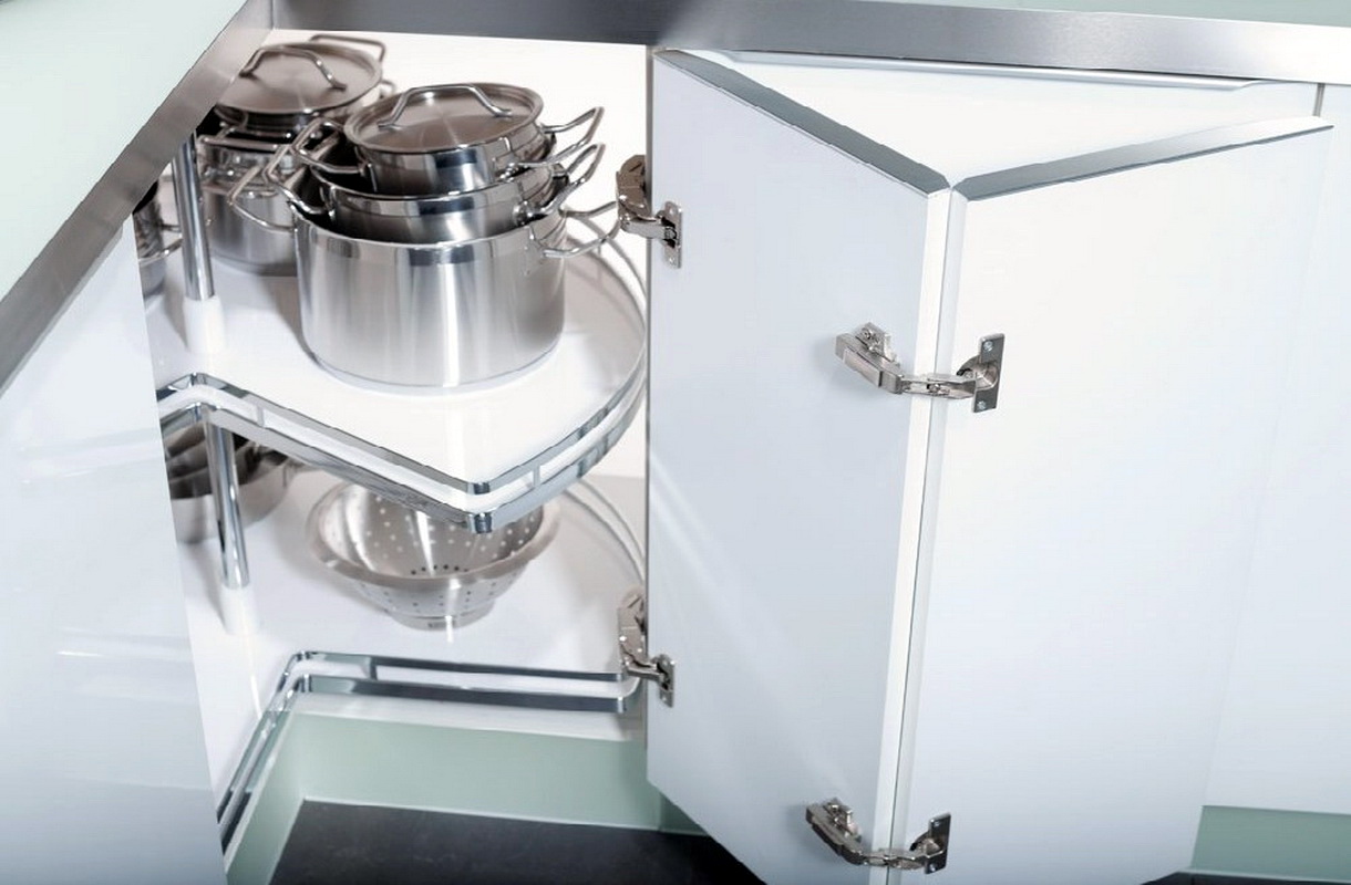 - With a right angle. Such a product resembles the outside of ordinary straight systems that stand next to each other. Most models are equipped with two separate doors without an internal partition. There are also cabinets, which are equipped with one door in the form of an accordion. This simulates two separate cabinets. Most often, various shelves and holders are attached to these surfaces.