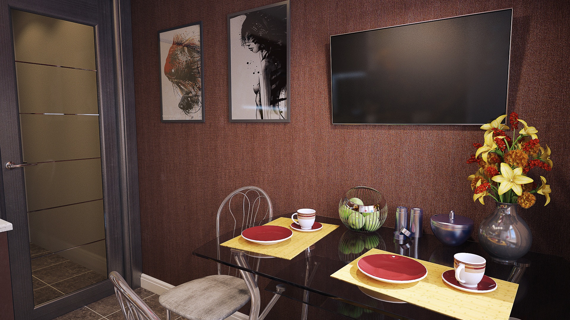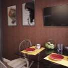 A bold and interesting solution would be to use photo wallpapers with large bright objects, highlighting the accent wall with rich red and orange colors. This interior path is applicable only for relatively large kitchen dining rooms.
