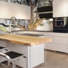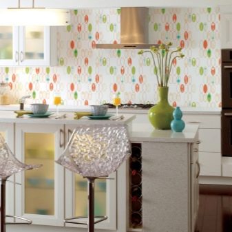 A modern style solution to the use of paper wallpaper in the interior of the kitchen was their use in the apron area. You can pick up the wallpaper of any pattern and paste over the work area with them by placing paper wallpaper under a sheet of refractory glass of the desired size. This design option looks very unusual, but at the same time practical, and definitely will not remain without attention of guests. In addition, a kitchen apron made of paper wallpaper under heat-resistant glass is an inexpensive option, in contrast to the design of ceramic tiles or similar glass with photo printing.