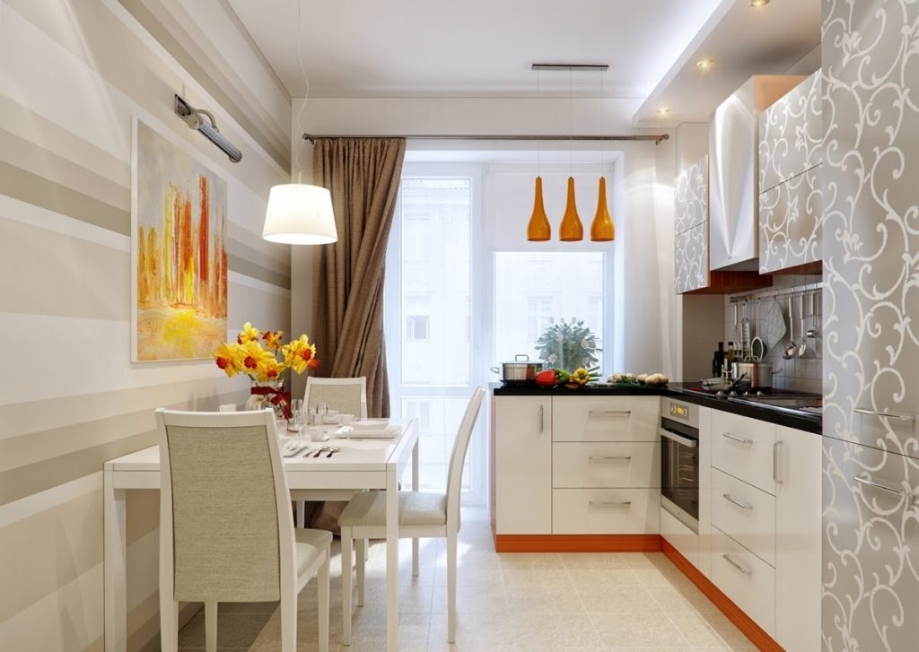 For a small kitchen, designers are advised to choose bright wallpaper, significantly expanding the space. But you should not do the kitchen in pristine white color, it will turn out to be uncomfortable, besides, for a small room such a sterile repair means frequent cleaning.