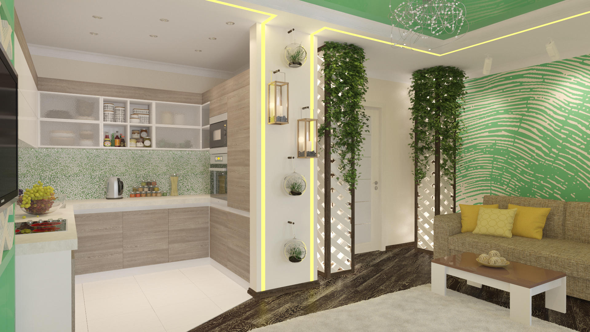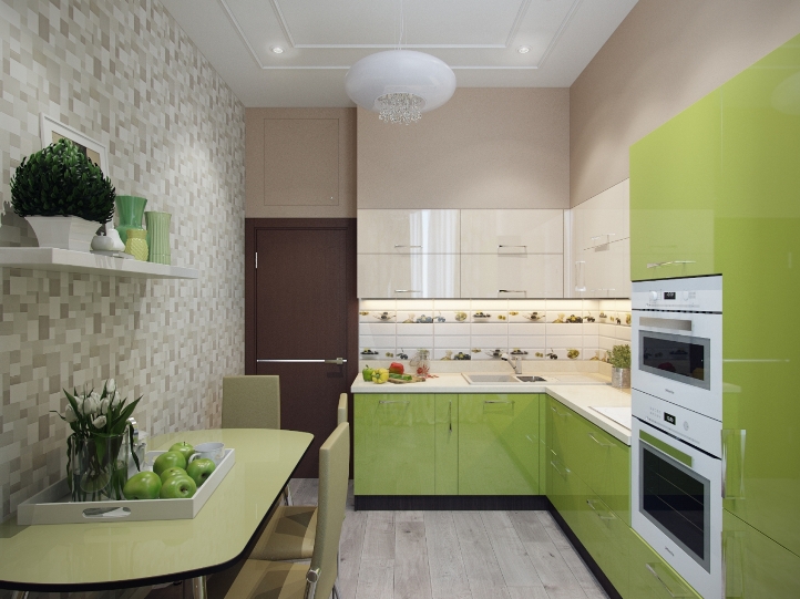 One of the main features when choosing the color of the wallpaper for the kitchen is their combination with the kitchen set. So, for the kitchen of today's fashionable green color, neutral wallpapers will suit perfectly: milky, beige, and light gray. Of course, the choice directly depends on the hue of the green color that you chose for the kitchen unit - the color of young green, mint, pistachio or rich lime color.