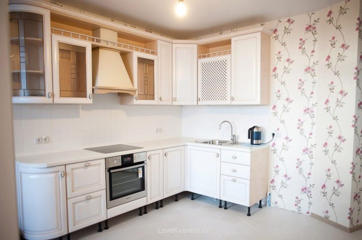 It is not forbidden to choose white wallpaper to match the white kitchen, but you should definitely use wallpaper with a pattern or a bright pattern so that the interior does not seem boring. It can be wallpaper with a grooved pattern in a geometric, vintage style, wallpaper with a bright pattern - flowers, animal or floral print.