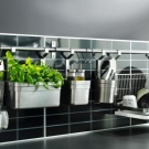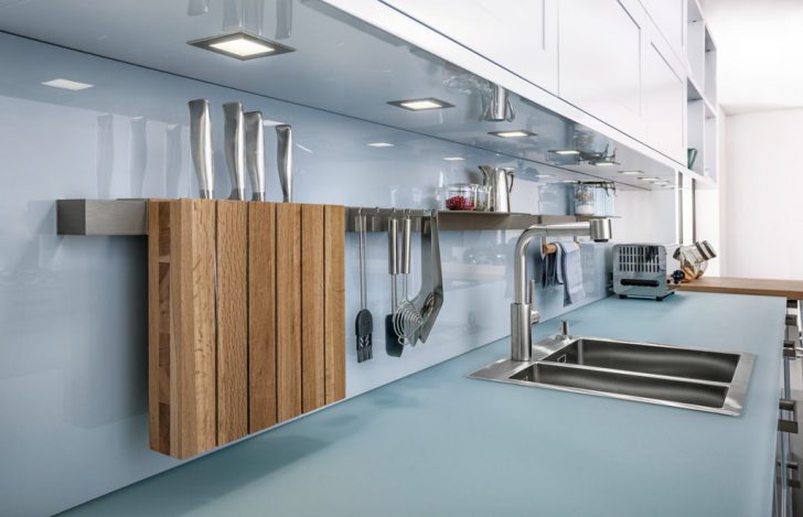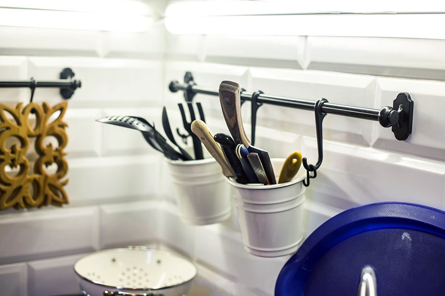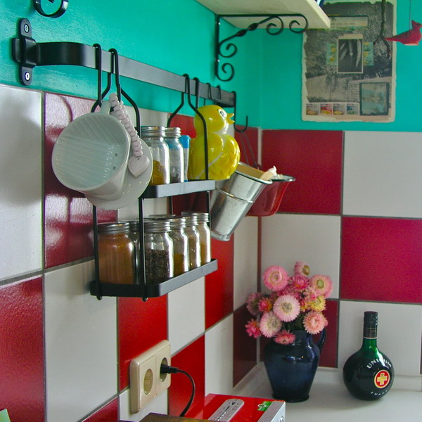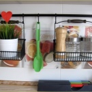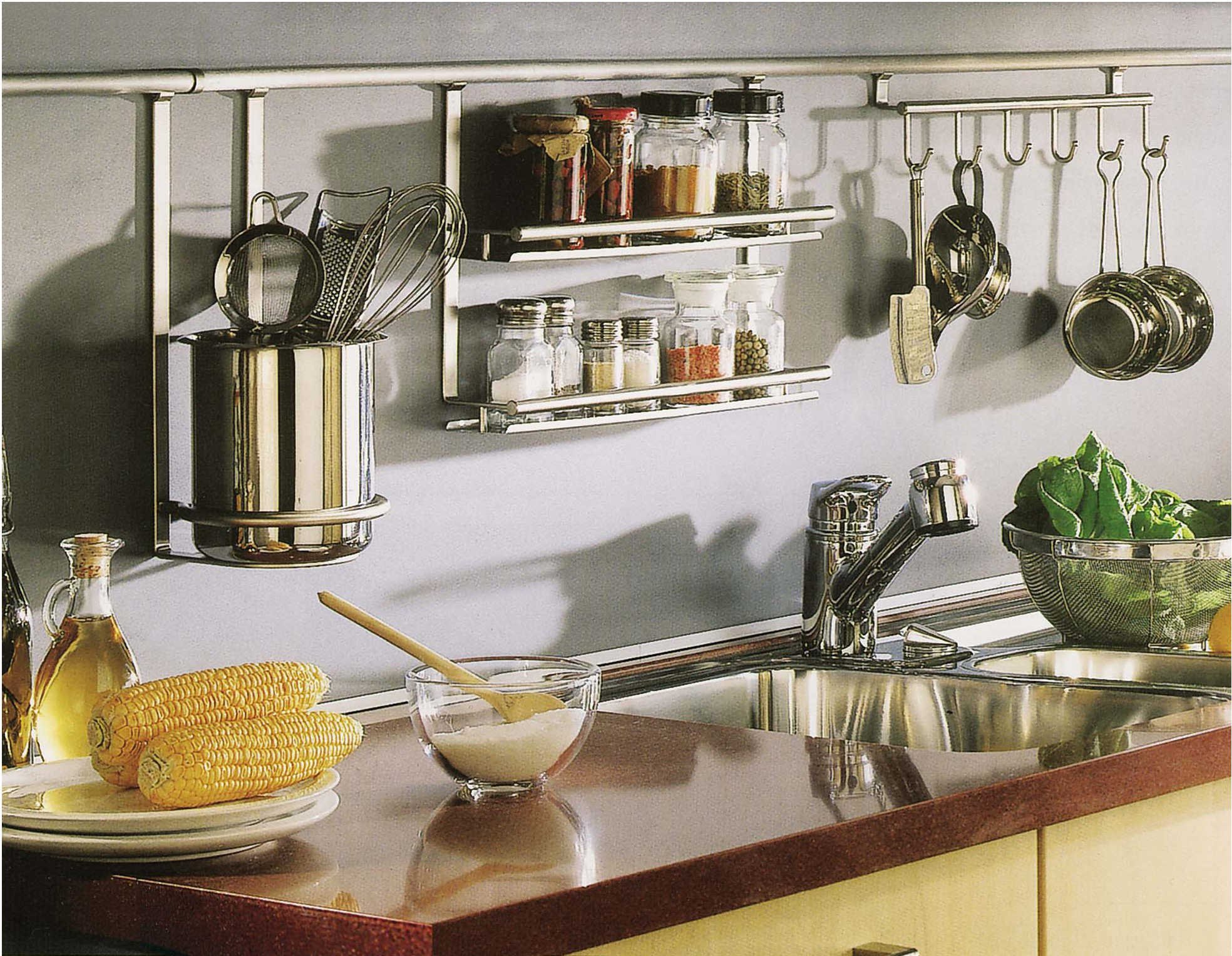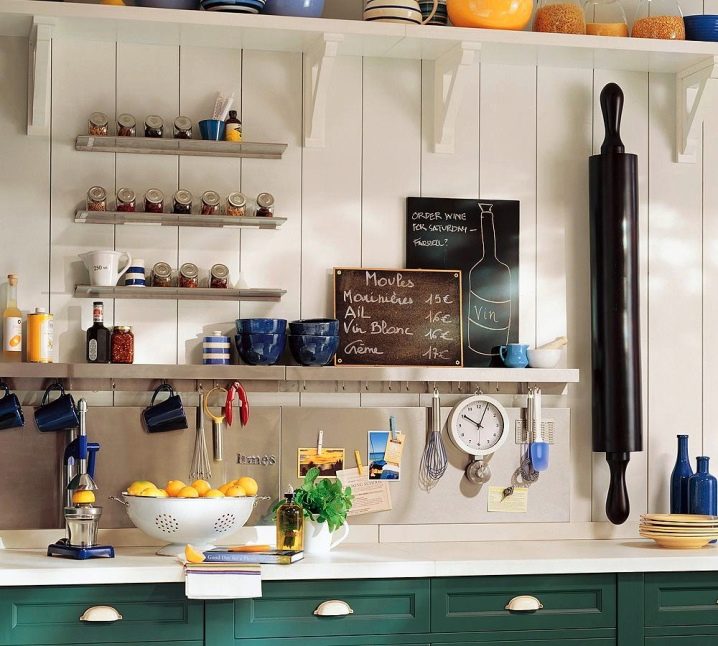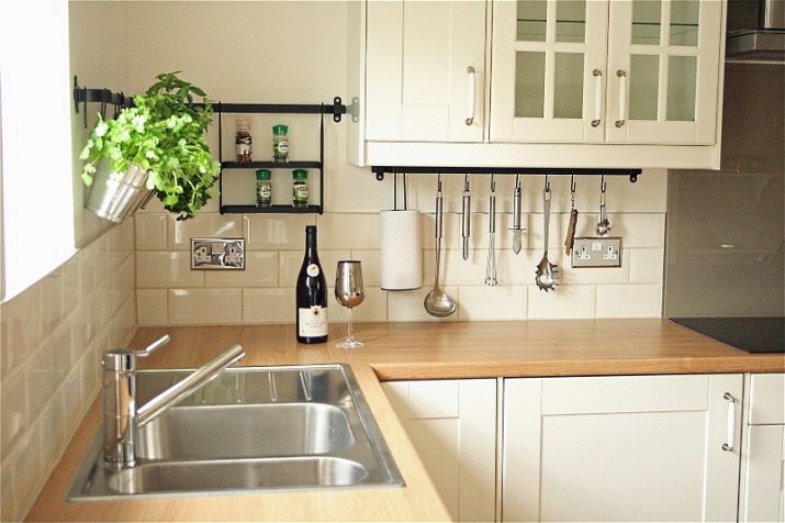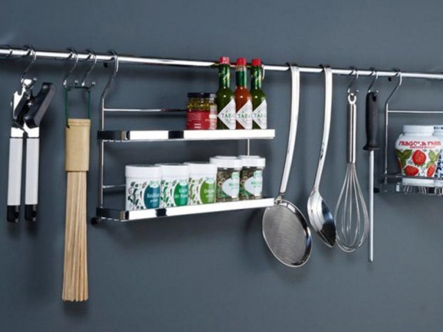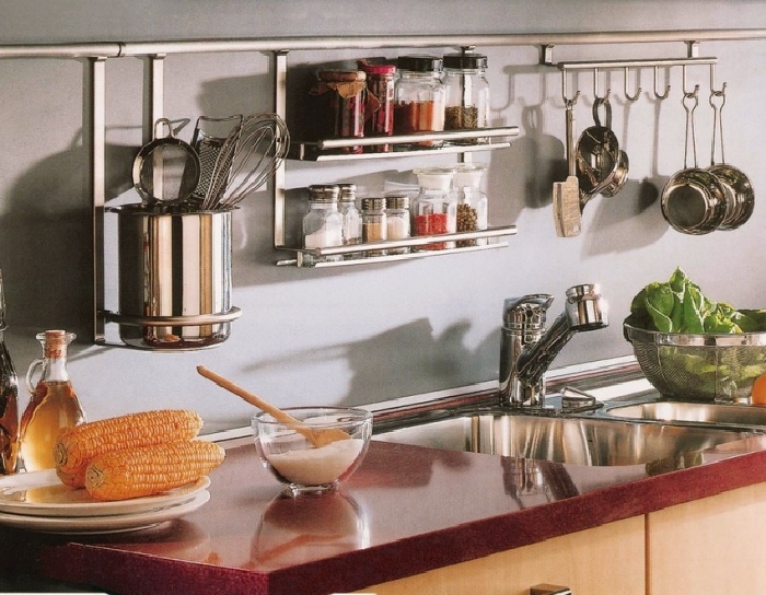 In a small kitchen, a large number of mounted structures and kitchen utensils hanging on them will only create a sense of confusion and will bring additional inconvenience. Therefore, for small rooms, it is better to choose short rails and place the most necessary things on them - shovels, knives, towels, spices.