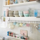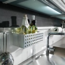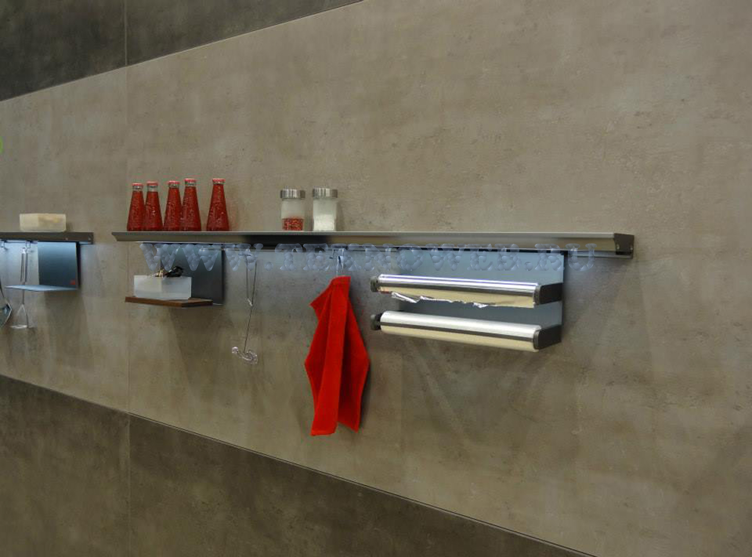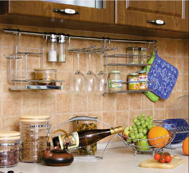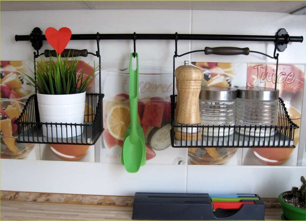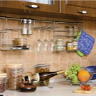 If space permits, on a horizontal railing, you can place a hanging bread box, a plate dryer, a cutlery shelf. It is convenient to hang the holder-holder for glasses on the highly fixed crossbar. Especially advantageous it looks above the bar. It is convenient to alternate shelves and hooks - this allows you to save space. In addition, the horizontal crossbar is convenient to use as a holder for large covers.