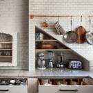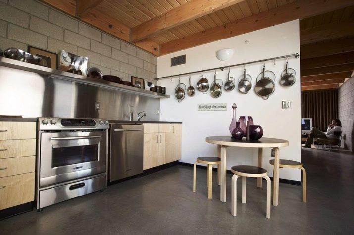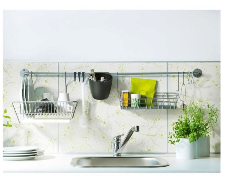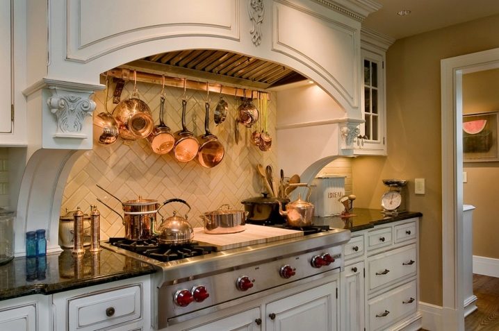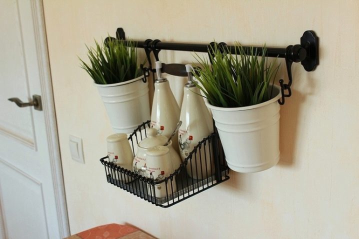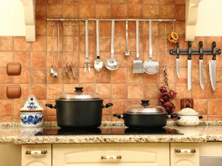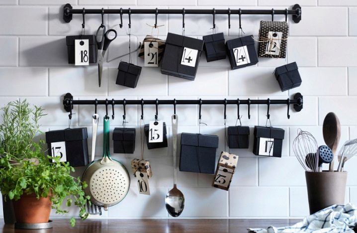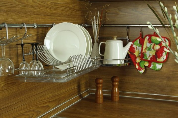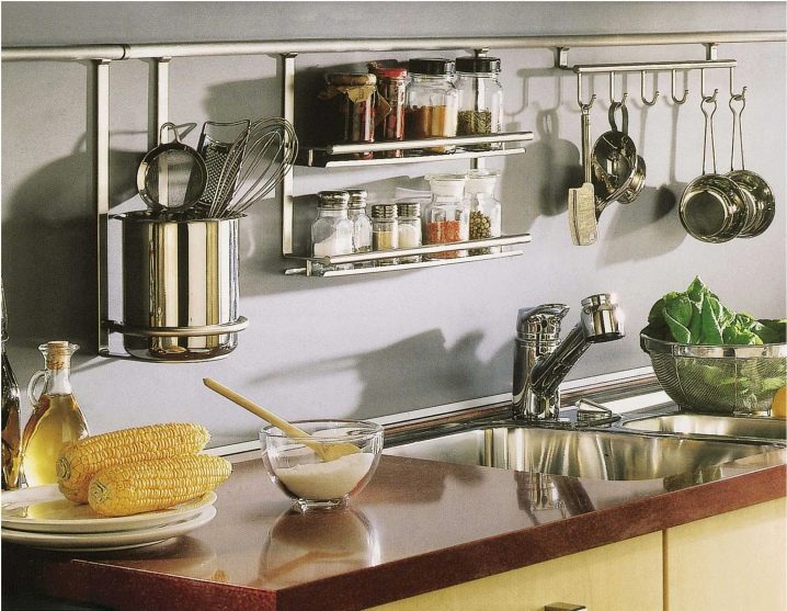 The word "railing" came to us from English, and in translation it means "rail", "railing" or "hanger".This design consists of one or several crossbeams with hooks, holders and stands that are attached to the kitchen apron, wall cabinets, sometimes even to the ceiling. Such a simple fixture allows to save a lot of space, at the same time it is convenient and affordable to place all the kitchen utensils.