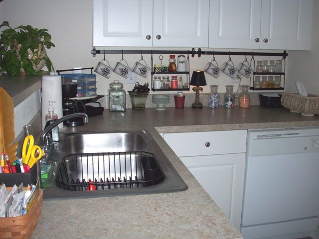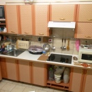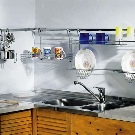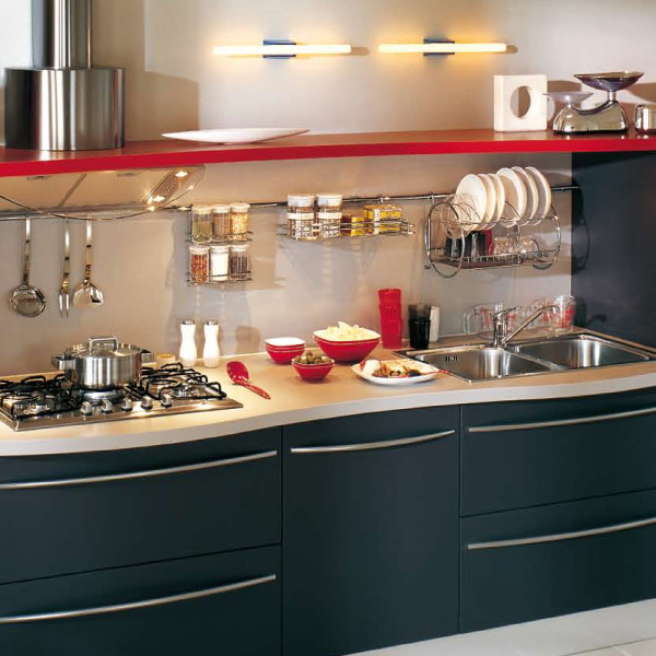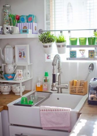 The spacious kitchen will look good long railing along the entire wall or above the work surface. If you have a corner sink, it makes sense to choose a corner structure and install shelves on it for convenient storage of detergents, sponges or cutlery.