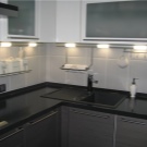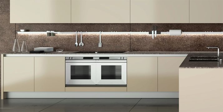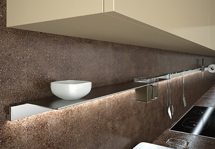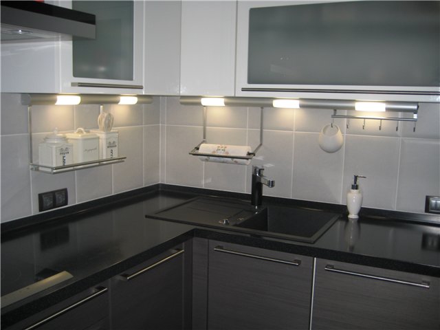 Illuminated rails suggest mounting near the main crossbar or between its parts of the LED lamp. This design is very convenient, since due to the wall cabinets on the working kitchen surface there is often not enough light.