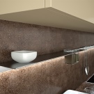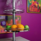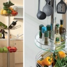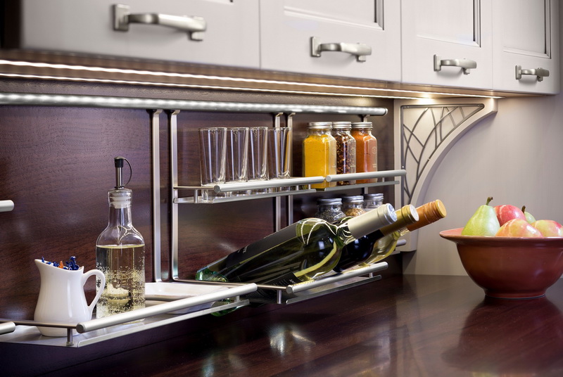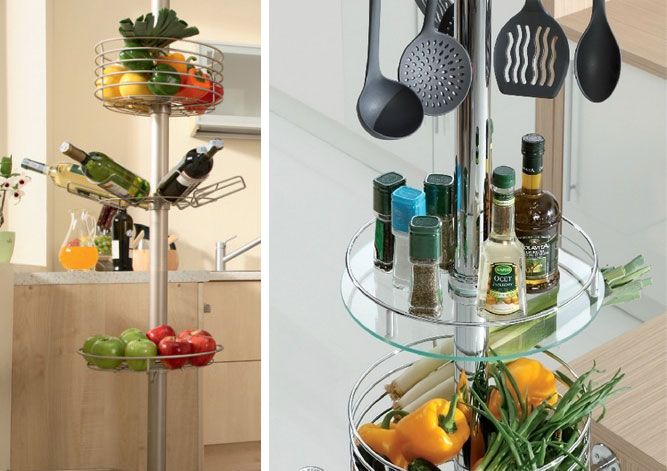 On a vertical railing fixed on a bar counter or tabletop, accessories for bottles and round, rotating shelves, where you can put fruits, arrange tea, coffee or place tea pairs and sets, will look spectacular.