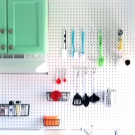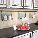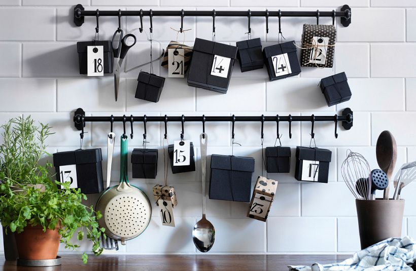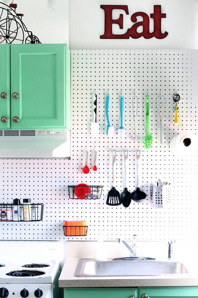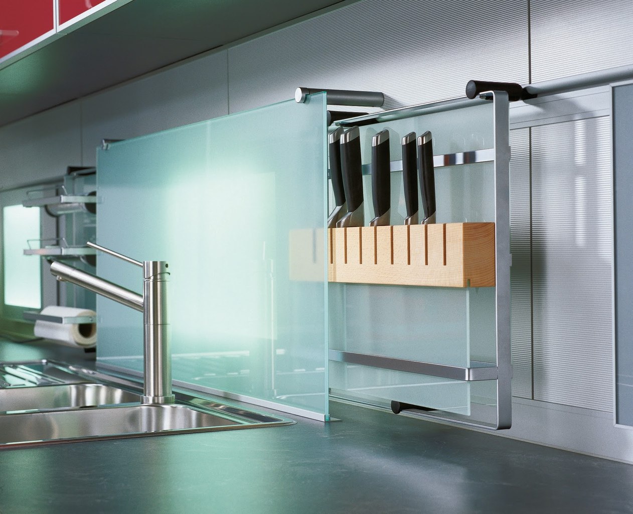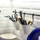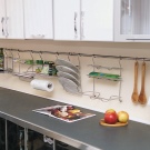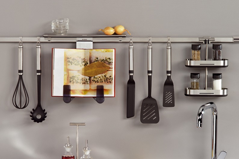 On the hooks above the work surface, it is best to hang out the tools that the hostess uses every day - shovels, skimmers, ladles, beaters, portion spoons and chopping boards. In the same place it is worth hanging up the holder for paper towels.Such holders usually come in a set of 2-3 pieces, they are convenient to cling one under the other.