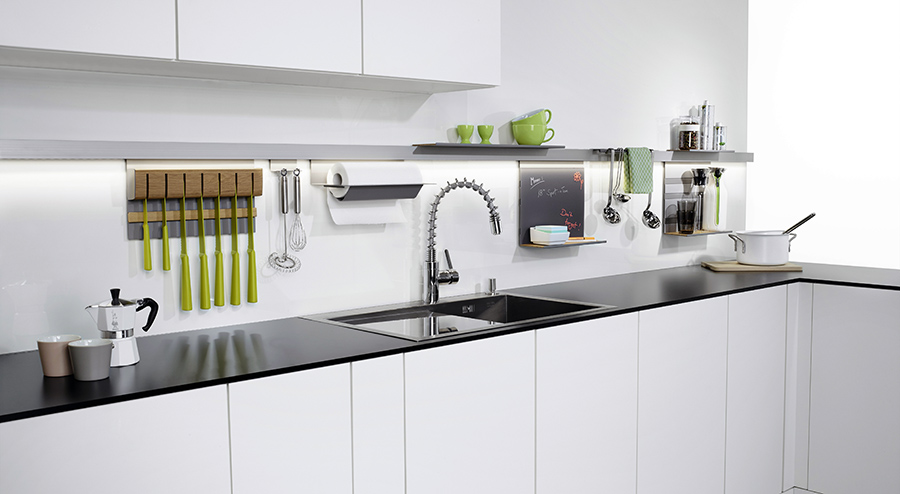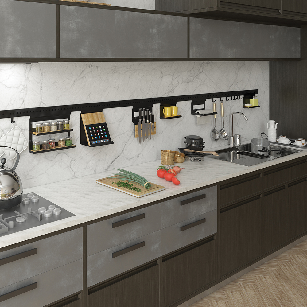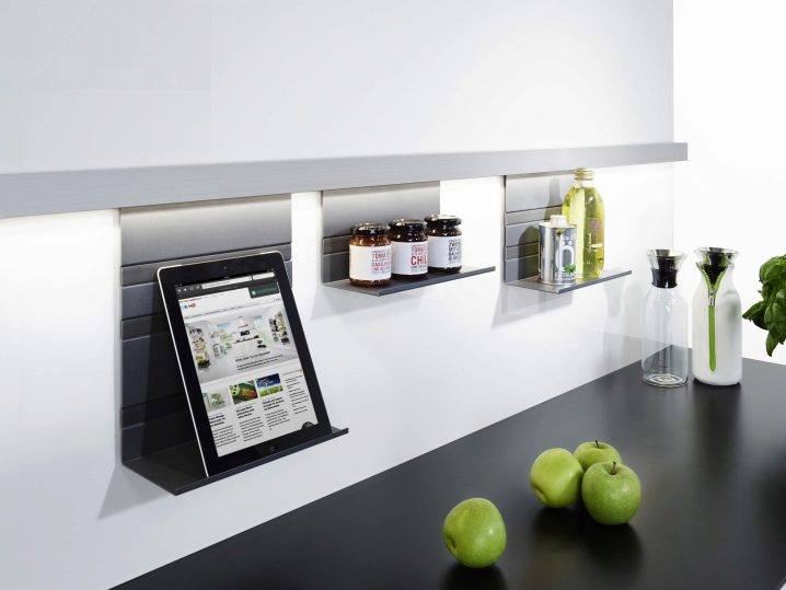 During its existence, the rails have firmly taken their place in the kitchen of every hostess. Whether convenient holders for paper towels or hinged shelves for cans and spices, hooks for portion spoons or tacks are needed - a huge number of modules are provided in the rail construction.