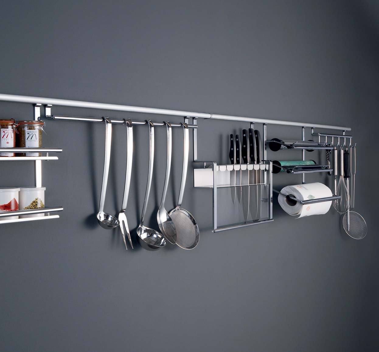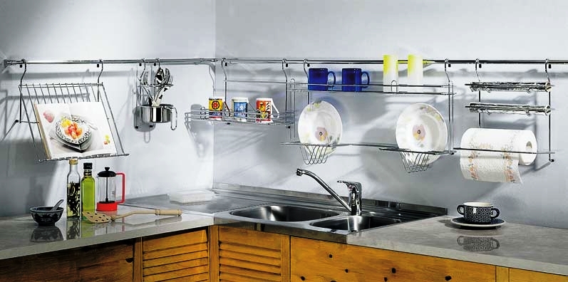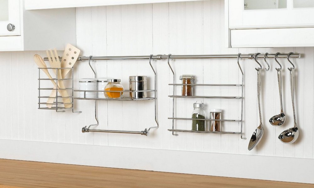 - Horizontal. This is the main type of data structures represented by one or several horizontal pipes, on which hooks, holders, pendants and everything else are hung. Not rarely horizontal rails come complete with kitchen sets, mounted under the wall cabinets.