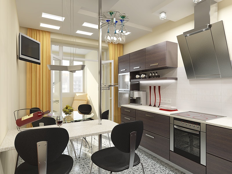 - Security. Due to the convenient location significantly reduces the likelihood of accidental burns, cuts and falls, often occurring due to the cramped kitchen.