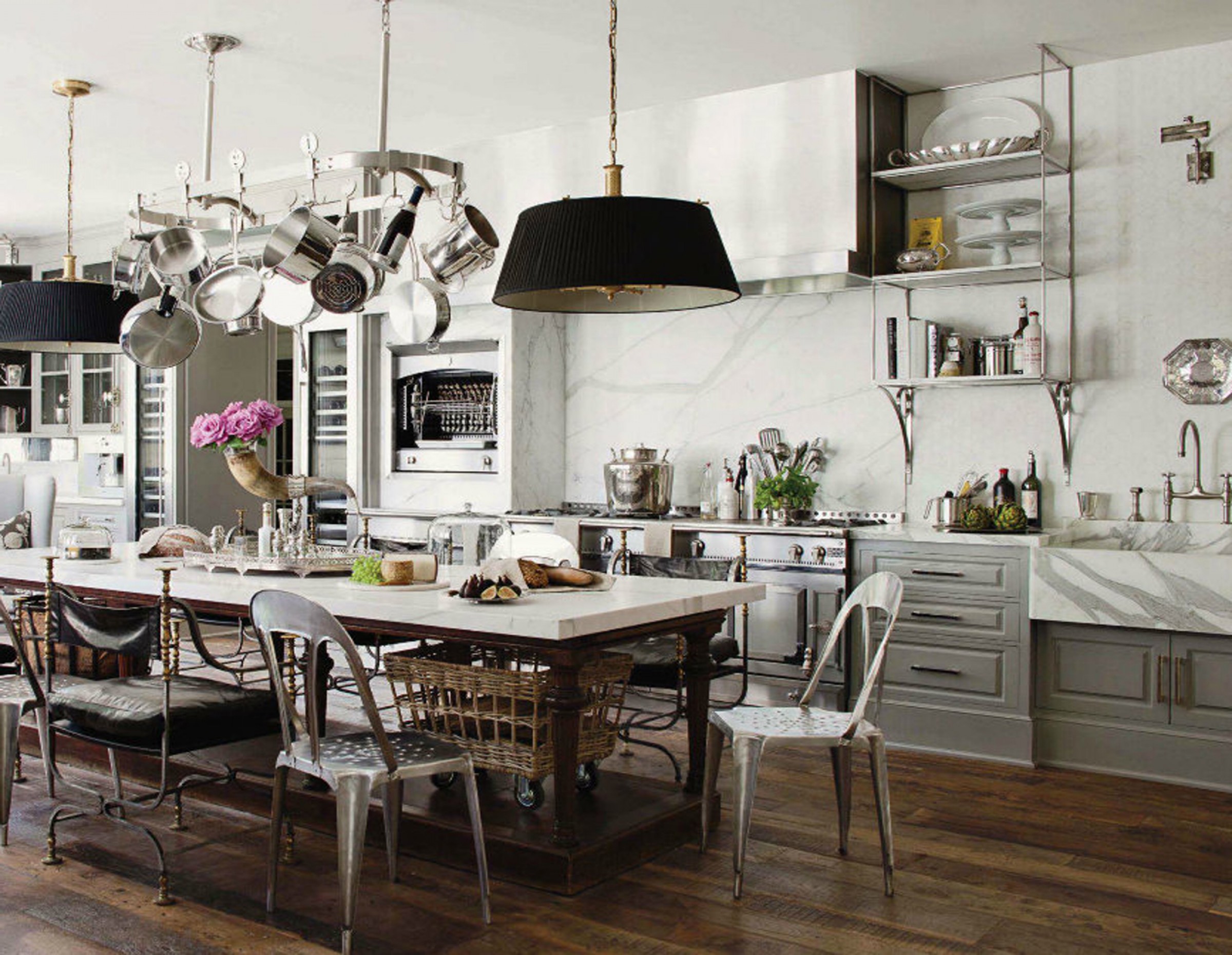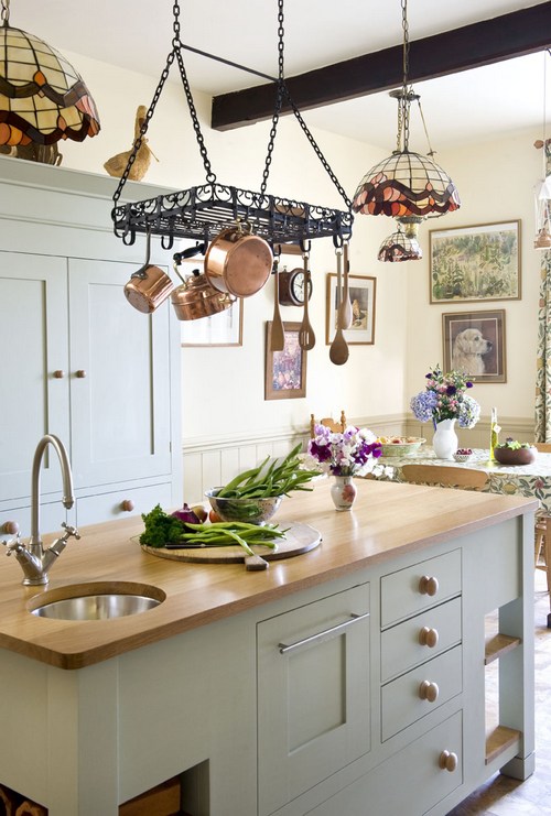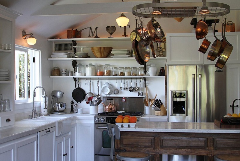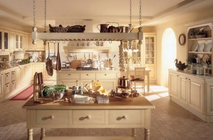 For an island-style kitchen, an overhead railing is an excellent solution - it solves the problem of the lack of spacious cupboards for dishes, and fits perfectly into the interior style.