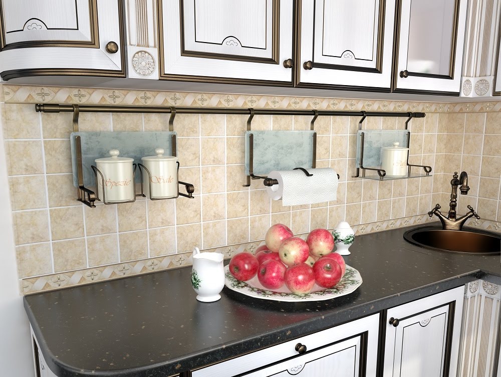 Stainless steel rails are applied various depositions: nickel, copper, matt chrome, brass and others. Depending on the interior of the kitchen, you can install different color designs. In the Provencal style kitchen will look beautiful white rails, and in the Victorian interior - gold.