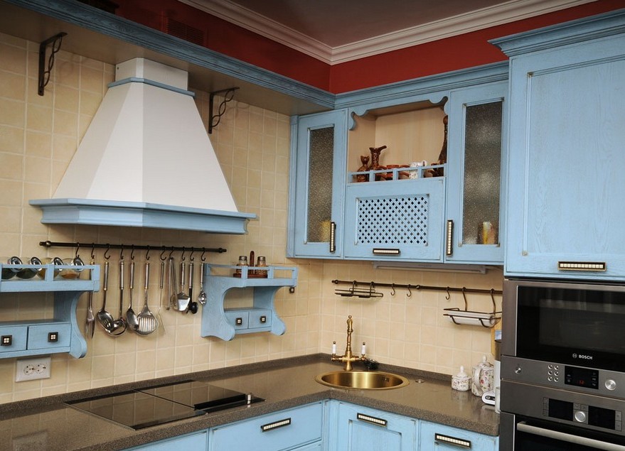 And the bundles of hot pepper, garlic or dried greens hung on the brackets will add folklore to the interior. The impression will be supplemented with decorative wooden spoons or cutting boards with folk painting.
