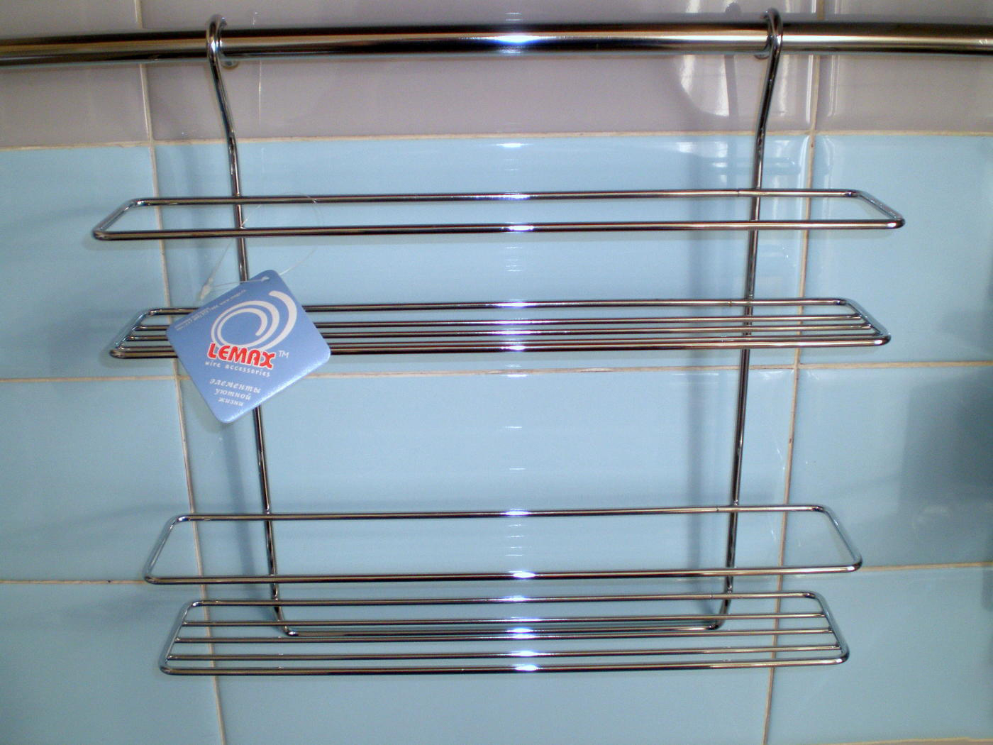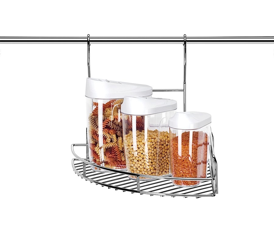 Corner railing is formed from two horizontal pipes using an additional corner 90. Thus, it is convenient to install corner grid shelves for storing trifles or dishwashing detergents.