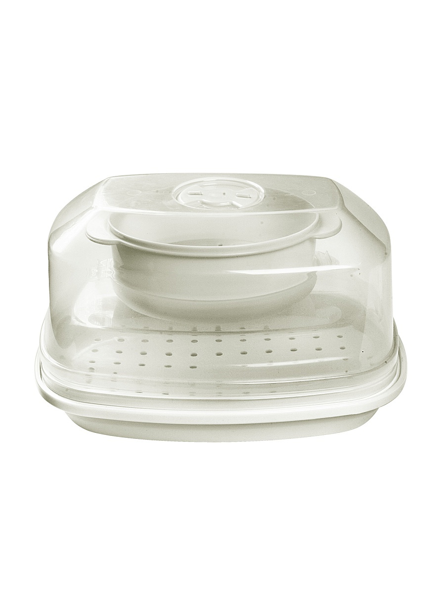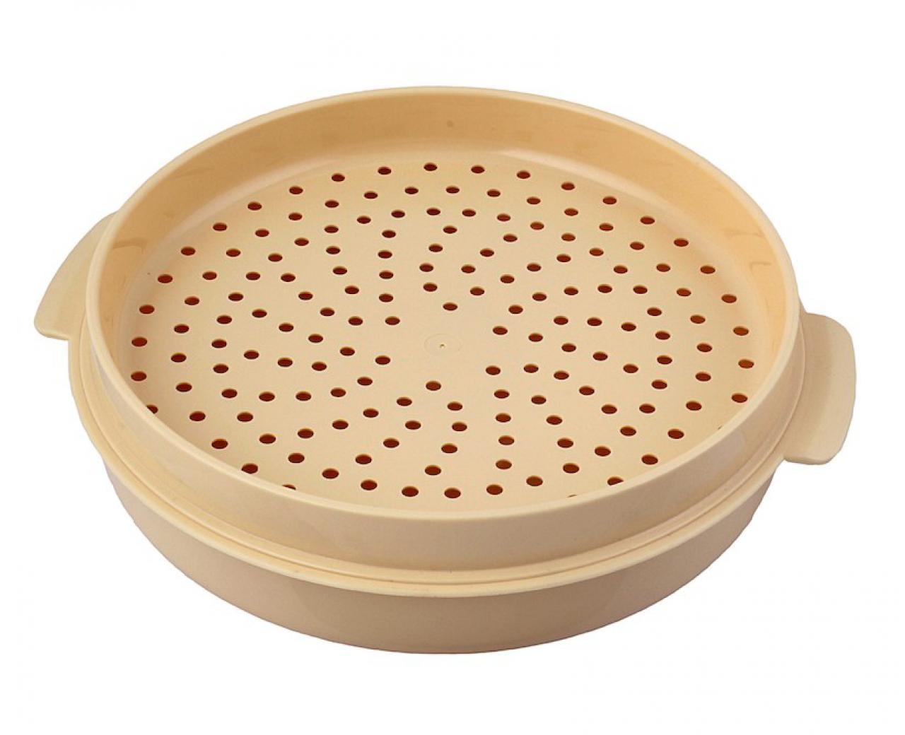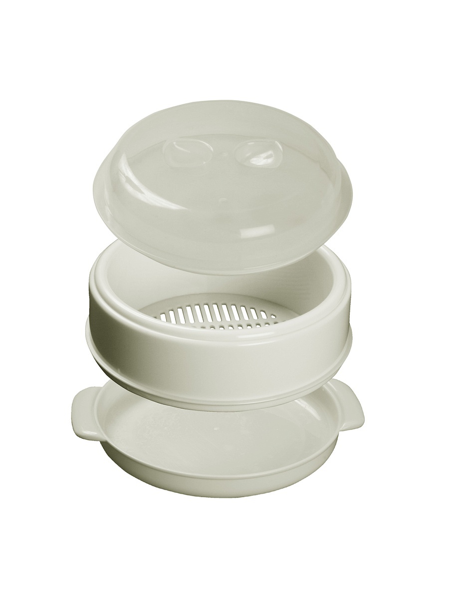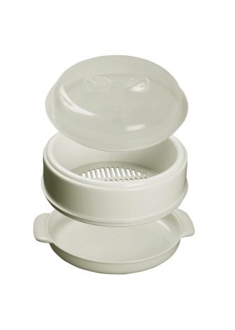 The built-in double boiler for the microwave oven is a plastic container, single-tier, two-level or two-component (consists of two main elements - a bowl for cooking and, a sieve), has a package for storage. The basic model offered by the domestic manufacturer Polimerbyt has three parts: a pallet, a grill and a cover. Steamers of a round, square and rectangular shape, different flowers are issued. It is best to work with a round - it is suitable for any microwave oven, but if you want to buy another shape, you can choose it, the difference in the final result does not make this moment. A microwave oven with the function of a double boiler will be the best purchase, and its owners will understand it after several uses.