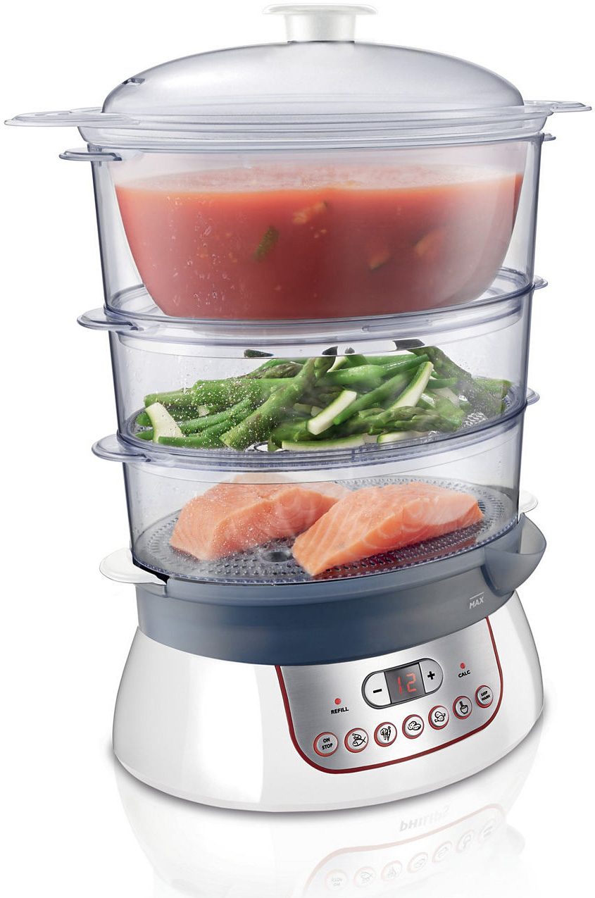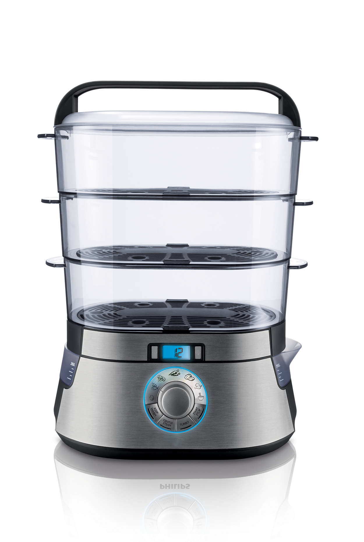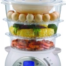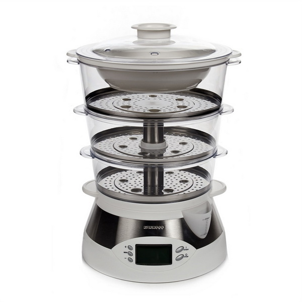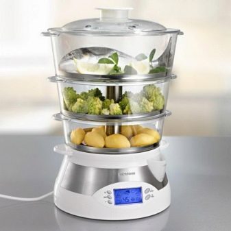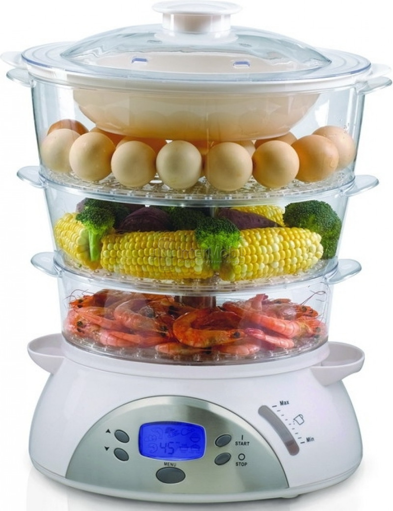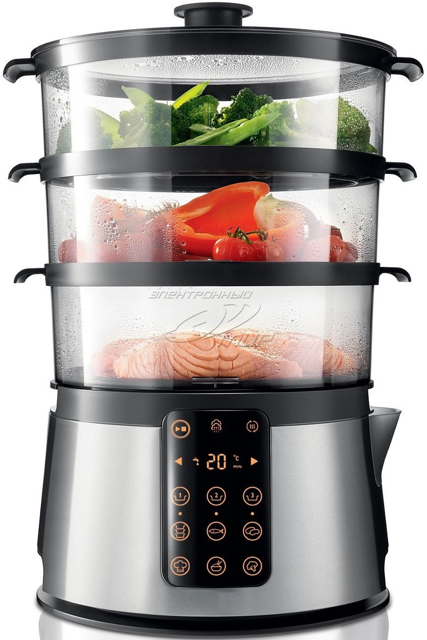 Differs steamer and environmental friendliness. The advantages include ease and ease of care.Lattices are better washed than plastic counterparts. Steamer comfortable to manage. The model has an LCD display that fully shows the cooking program and the remaining seconds and minutes. You can pre-select a cooking program: chicken, fish, vegetables and others.