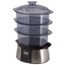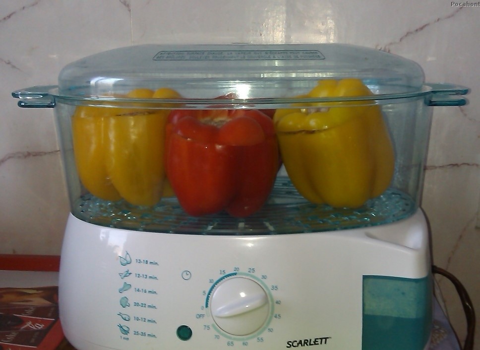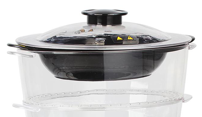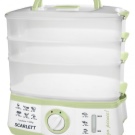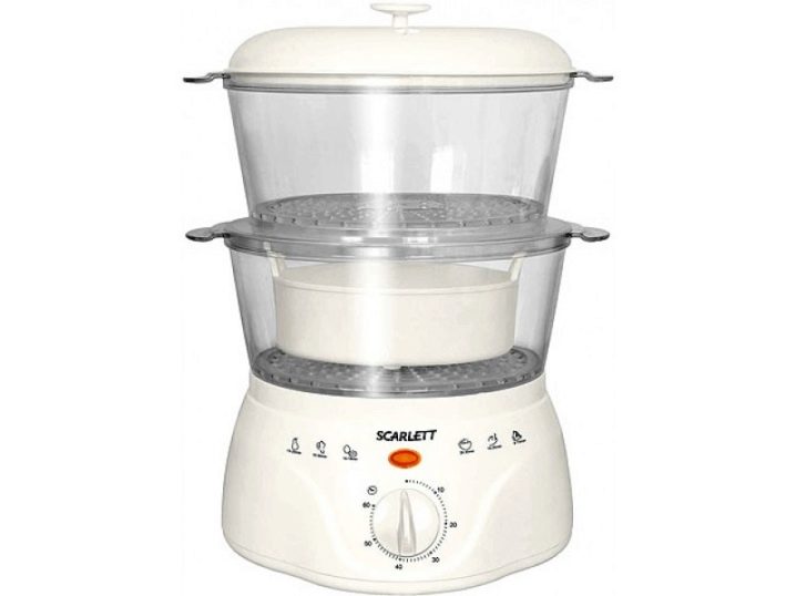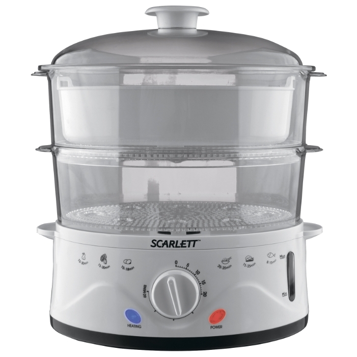 Model Scarlett SC 142 has 2 bowls of transparent plastic with a volume of 2.5 liters. The control panel is also very simple - with a mechanical timer for a maximum time of 60 minutes, tips for various types of products and a light indicator. Of the additional features: the mode of "quick steam", deepening for boiling eggs, a bowl for rice and compact storage.The weight of the device with all the components is 1.6 kg, the working power is 800 W, the body itself is made of white plastic.