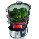 The timer is set using a mechanical handle, the maximum running time is 60 minutes. At the end of the specified time, a loud signal is heard. There is a function "Quick steam", which allows you to cook dishes in a shorter time. In addition, on the front panel of the device there is a light indicator on, prompts about the optimal cooking time for different types of products.