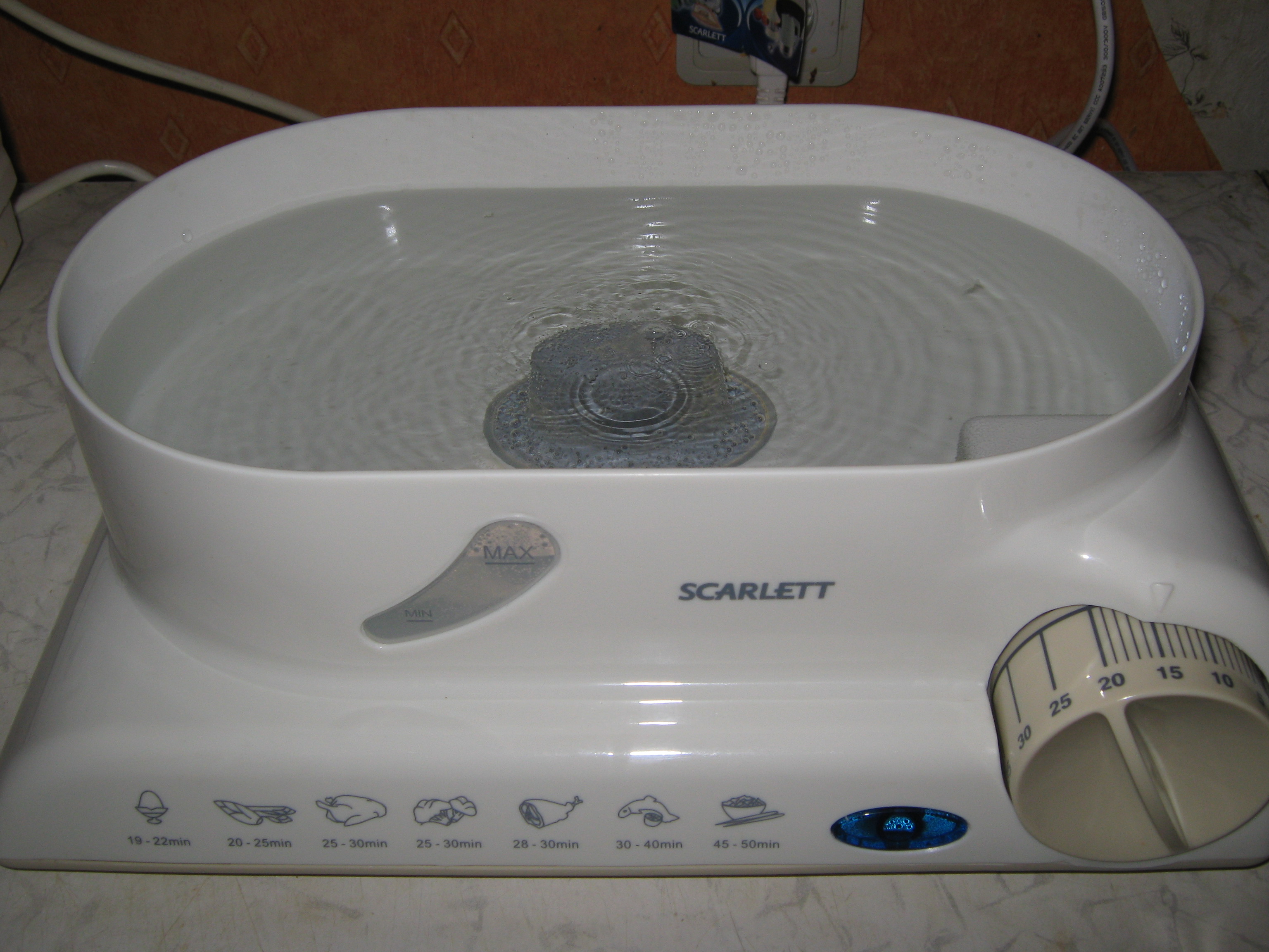 Spacious model Scarlett SC 1342 has 2 baskets with volumes of 3.2 liters each, so it can be used for a large family. Management, as in the previous versions, is the simplest and is limited to the mechanical handle of the timer setting. The device is equipped with a water level indicator, there is a function of its topping up during operation. After turning on the steam begins to be produced after 30 seconds. The sound of the timer signal is very loud, it can be heard from any room in the apartment.