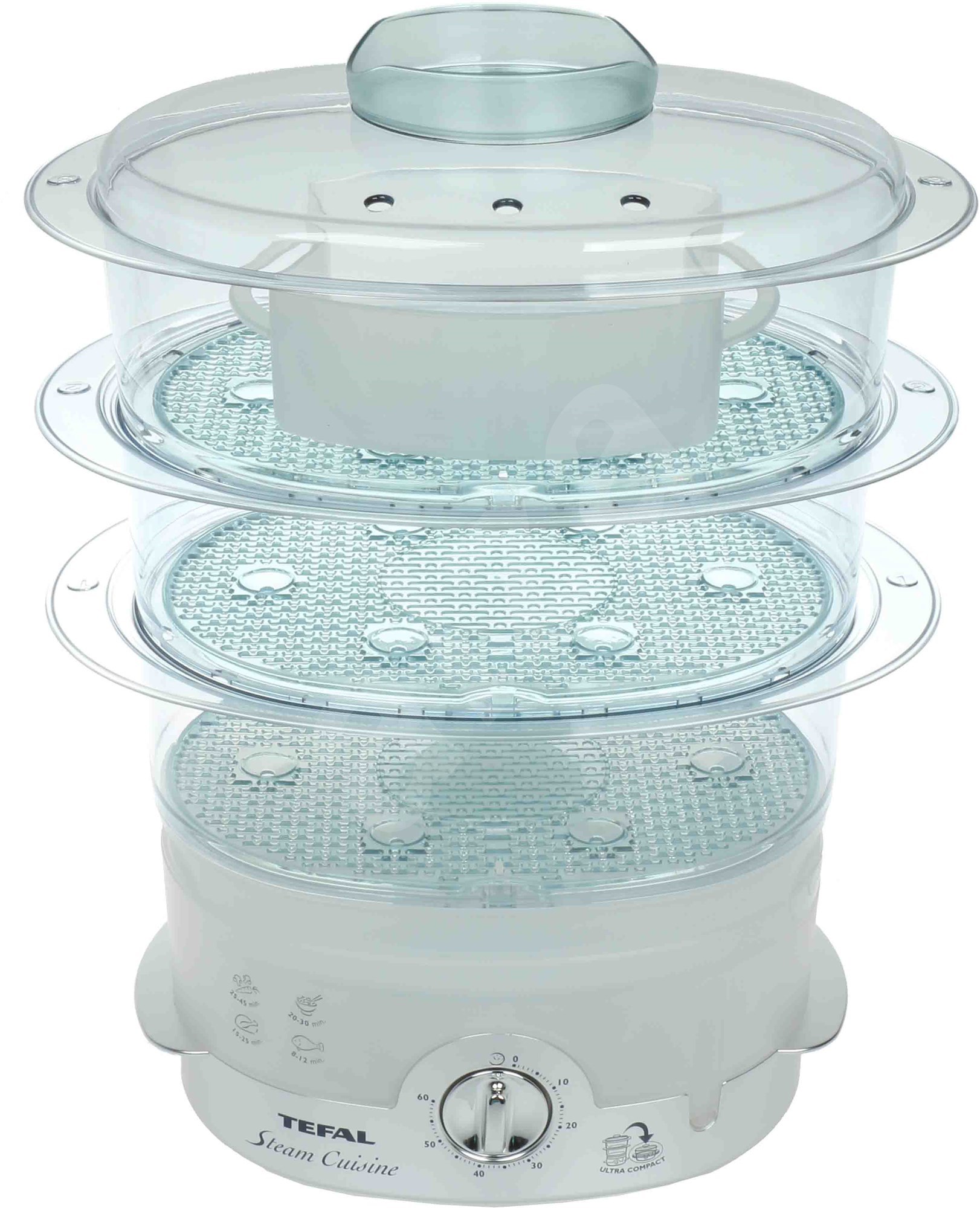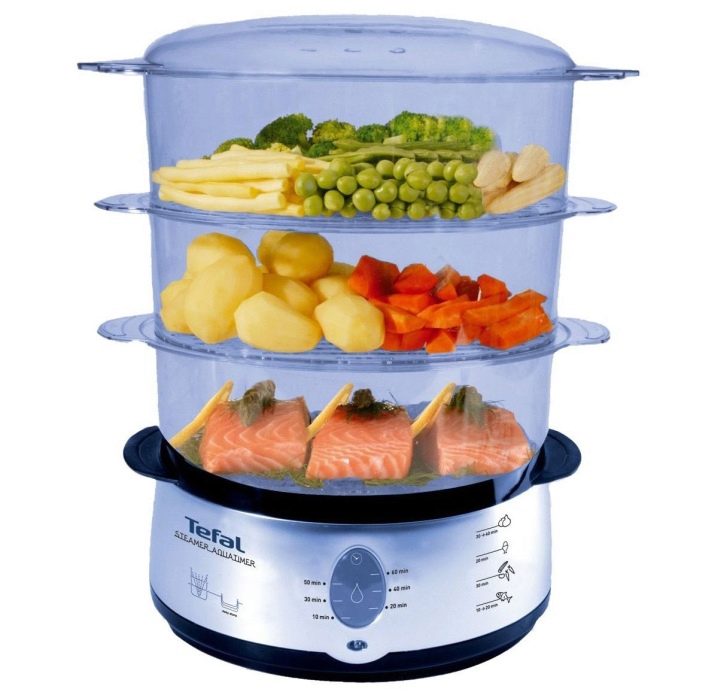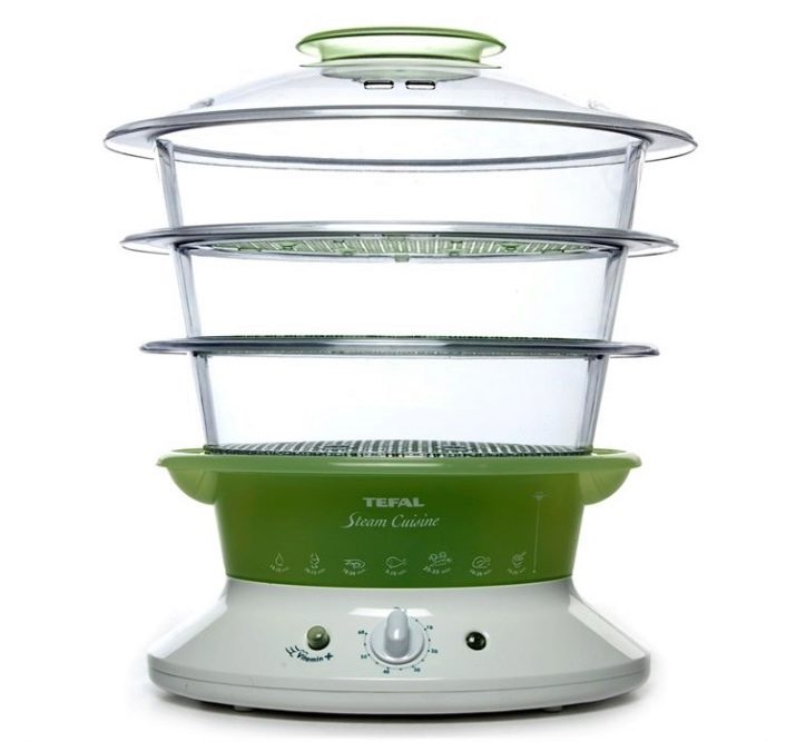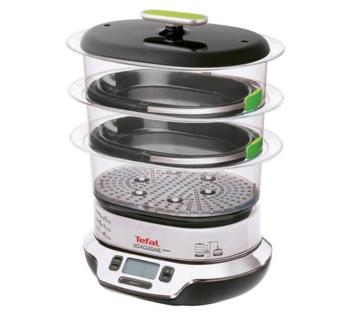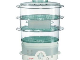 - Steamer Tefal VC3008 "Steam-n-light"has a compact size, as well as excellent capacity. It also has three levels with the ability to cook not only in the mesh basket, but also in special pallets for sauce and marinade.