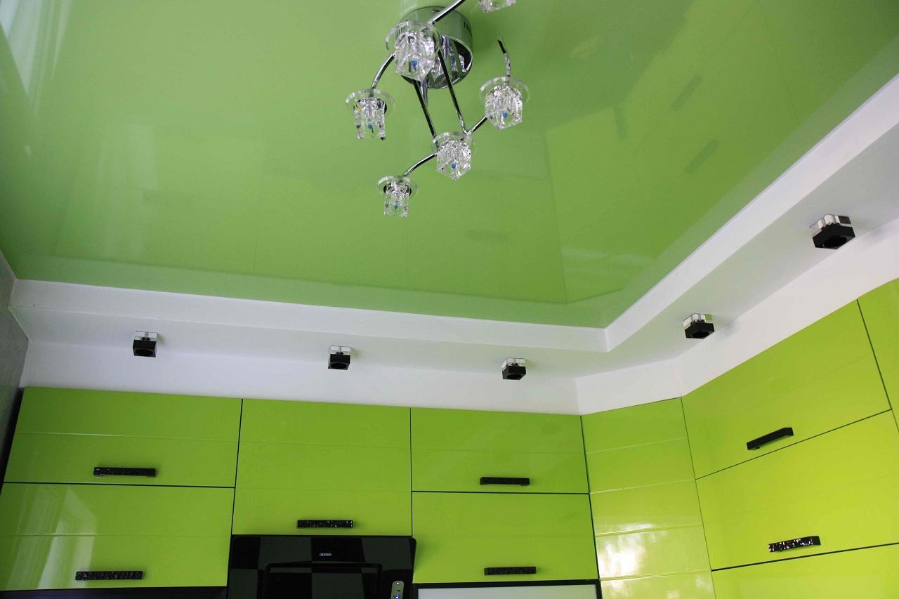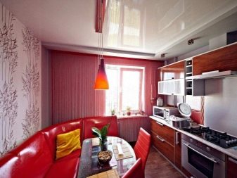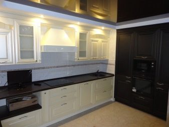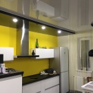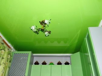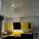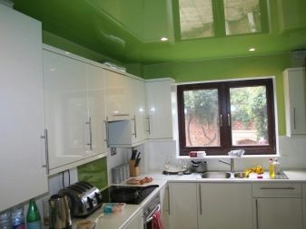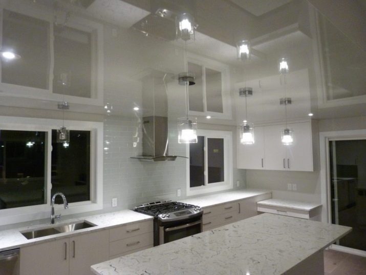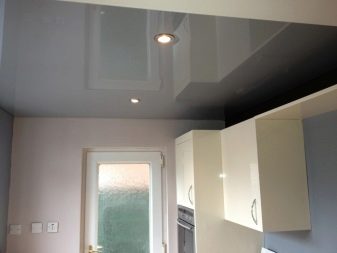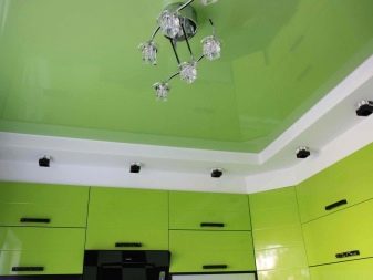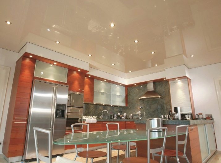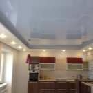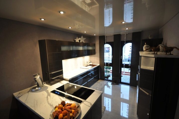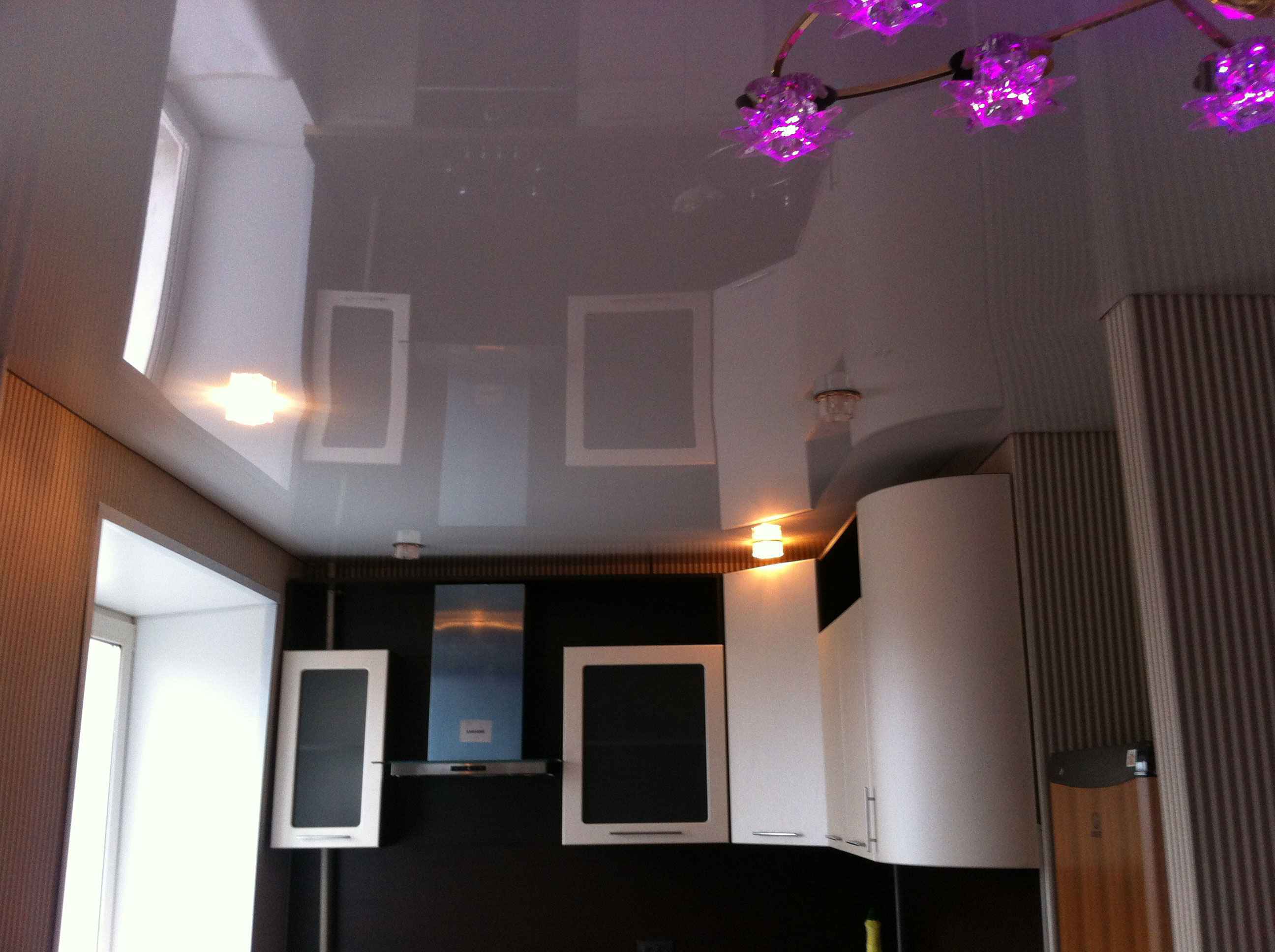 Designers are advised to use vinyl film with a glossy texture in small rooms, kitchens up to 7 square meters. The mirror surface of such material reflects up to 85% of light. This will help to visually expand the square meters, increase the space. Selecting the light colors of the ceilings, you also risk to make the kitchen more spacious.
