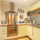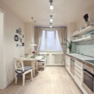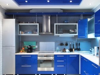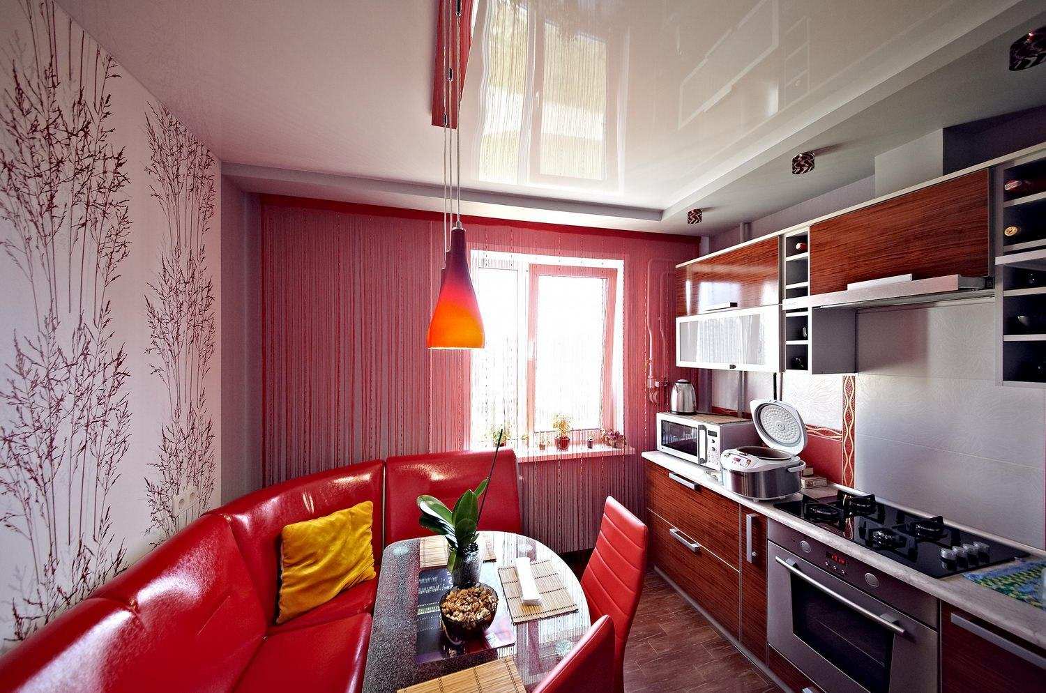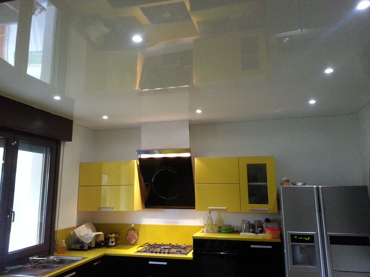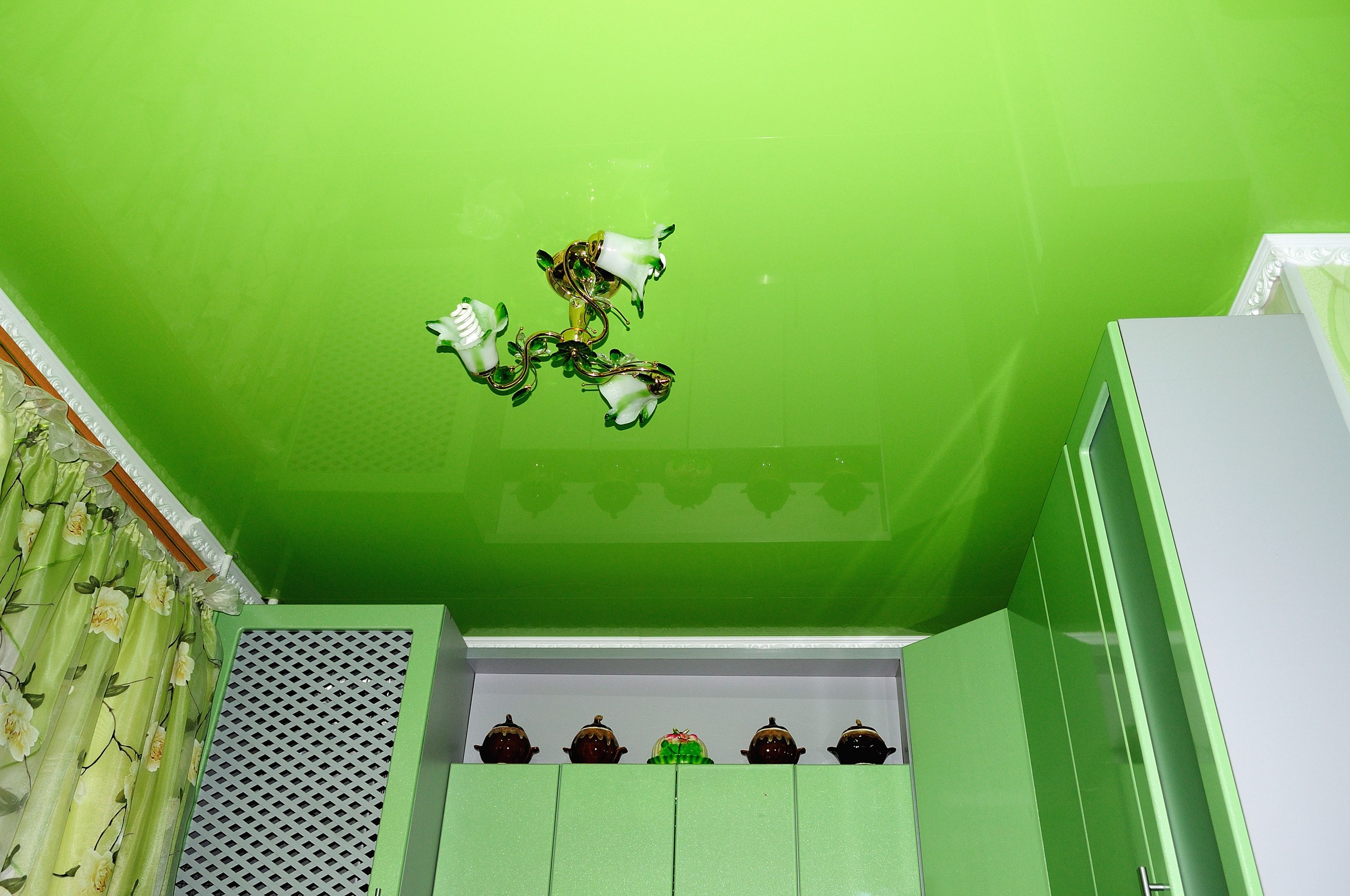 Designers are advised to use vinyl film with a glossy texture in small rooms, kitchens up to 7 square meters. The mirror surface of such material reflects up to 85% of light. This will help to visually expand the square meters, increase the space. Selecting the light colors of the ceilings, you also risk to make the kitchen more spacious.