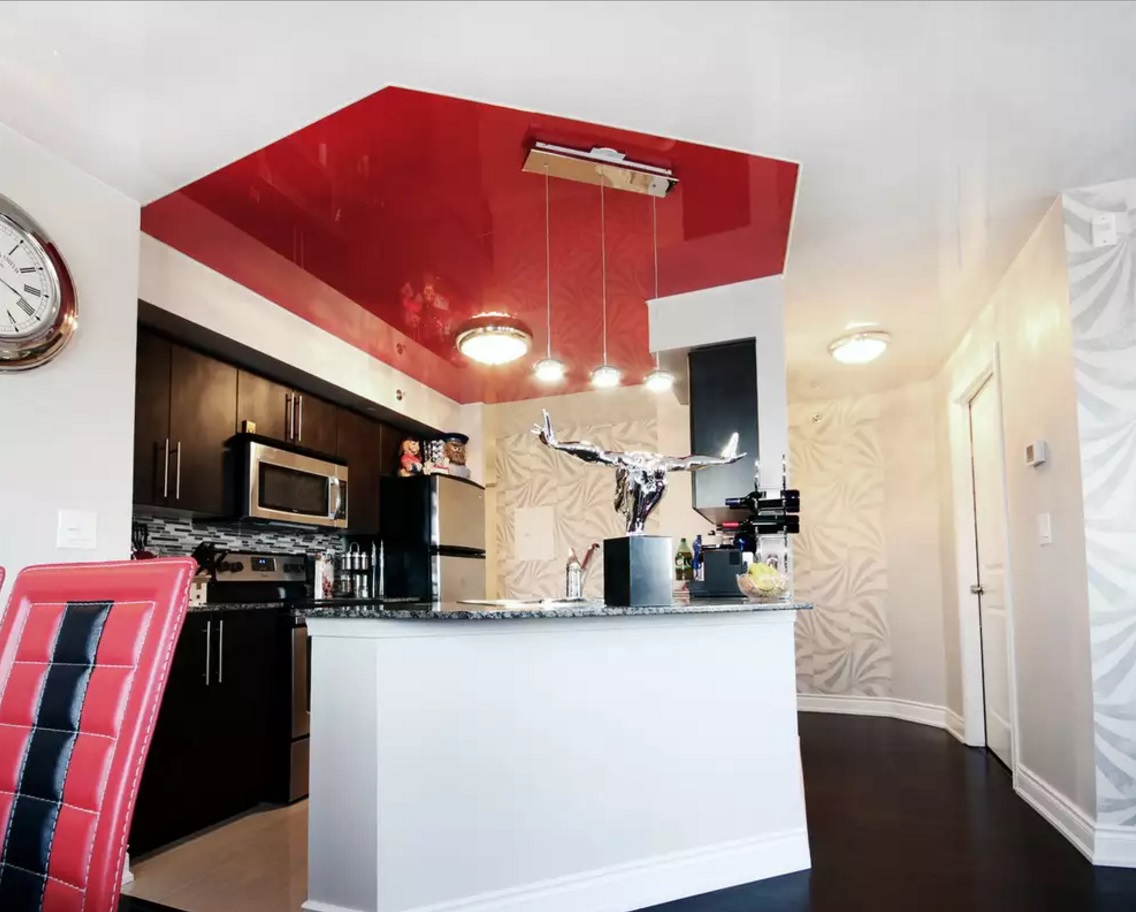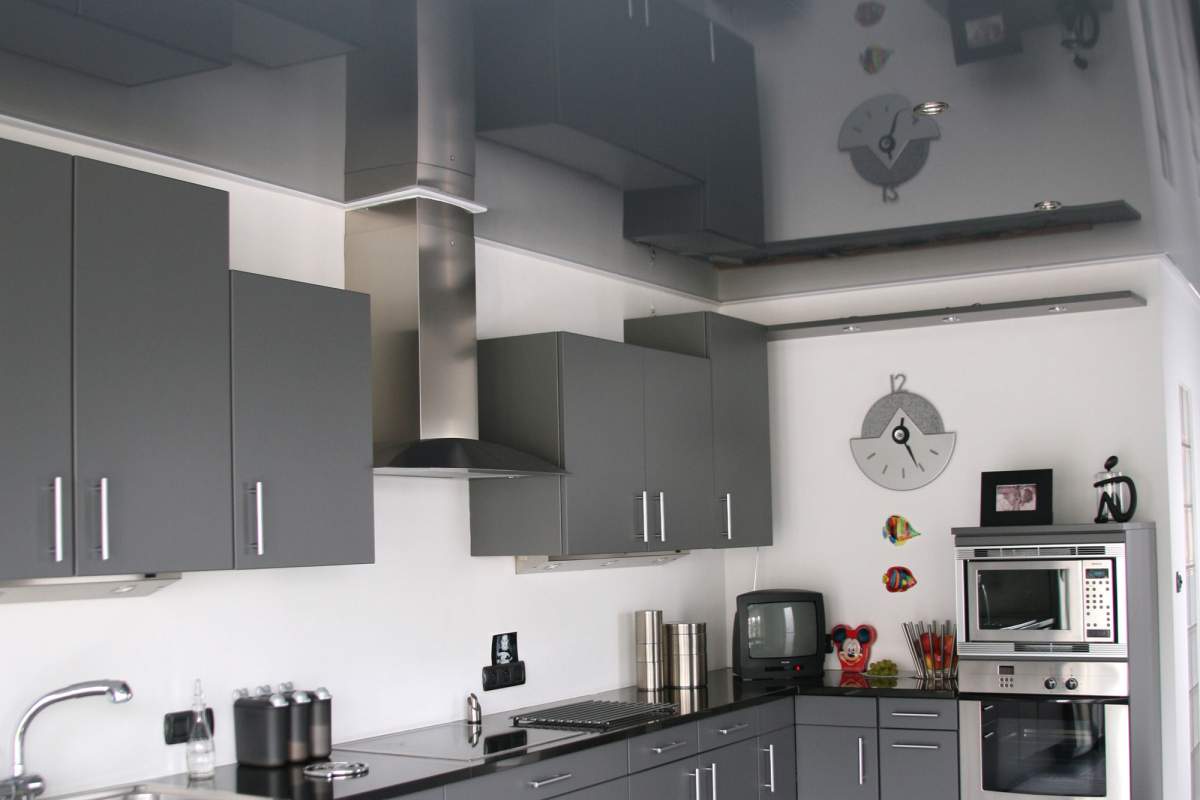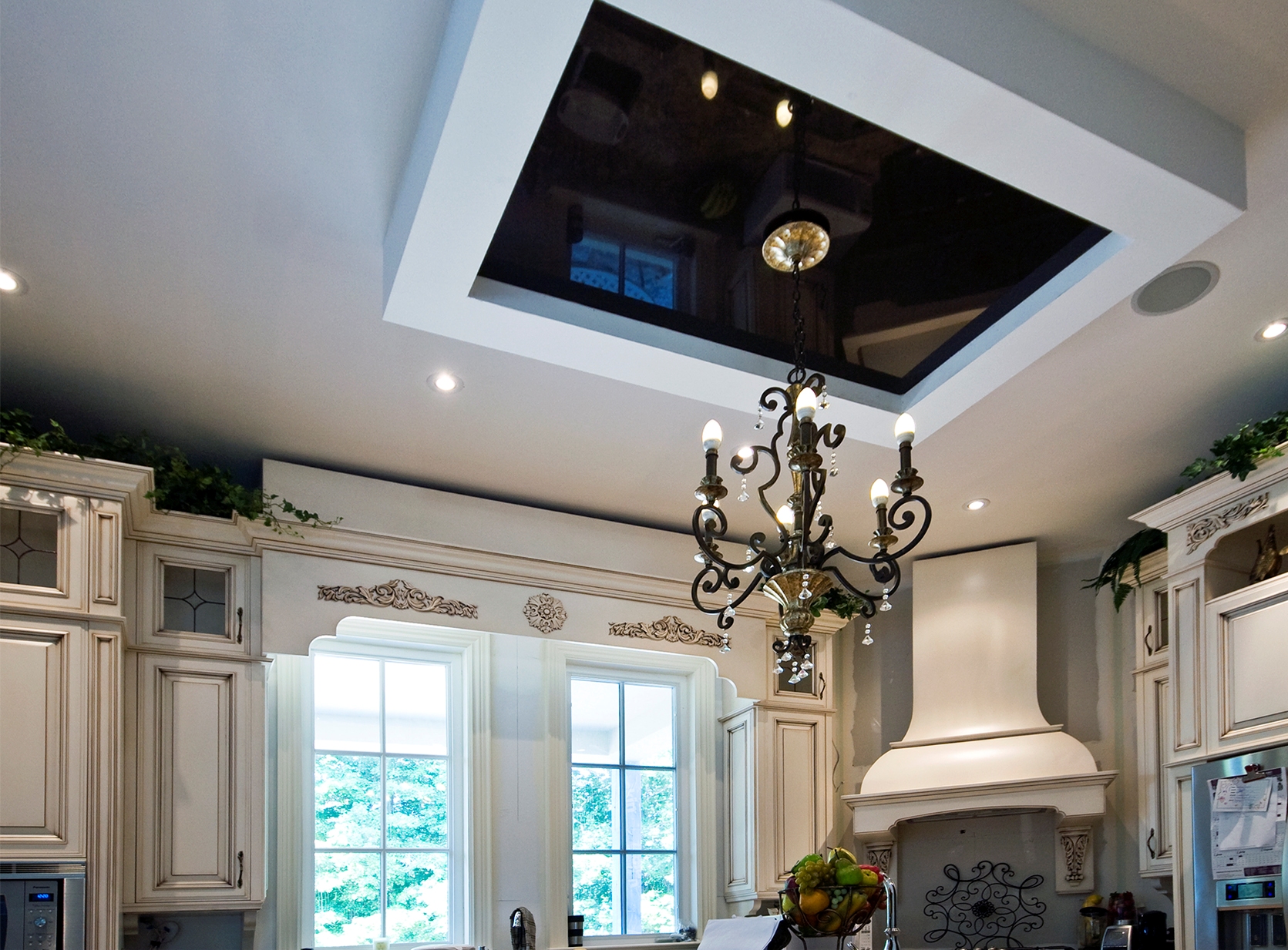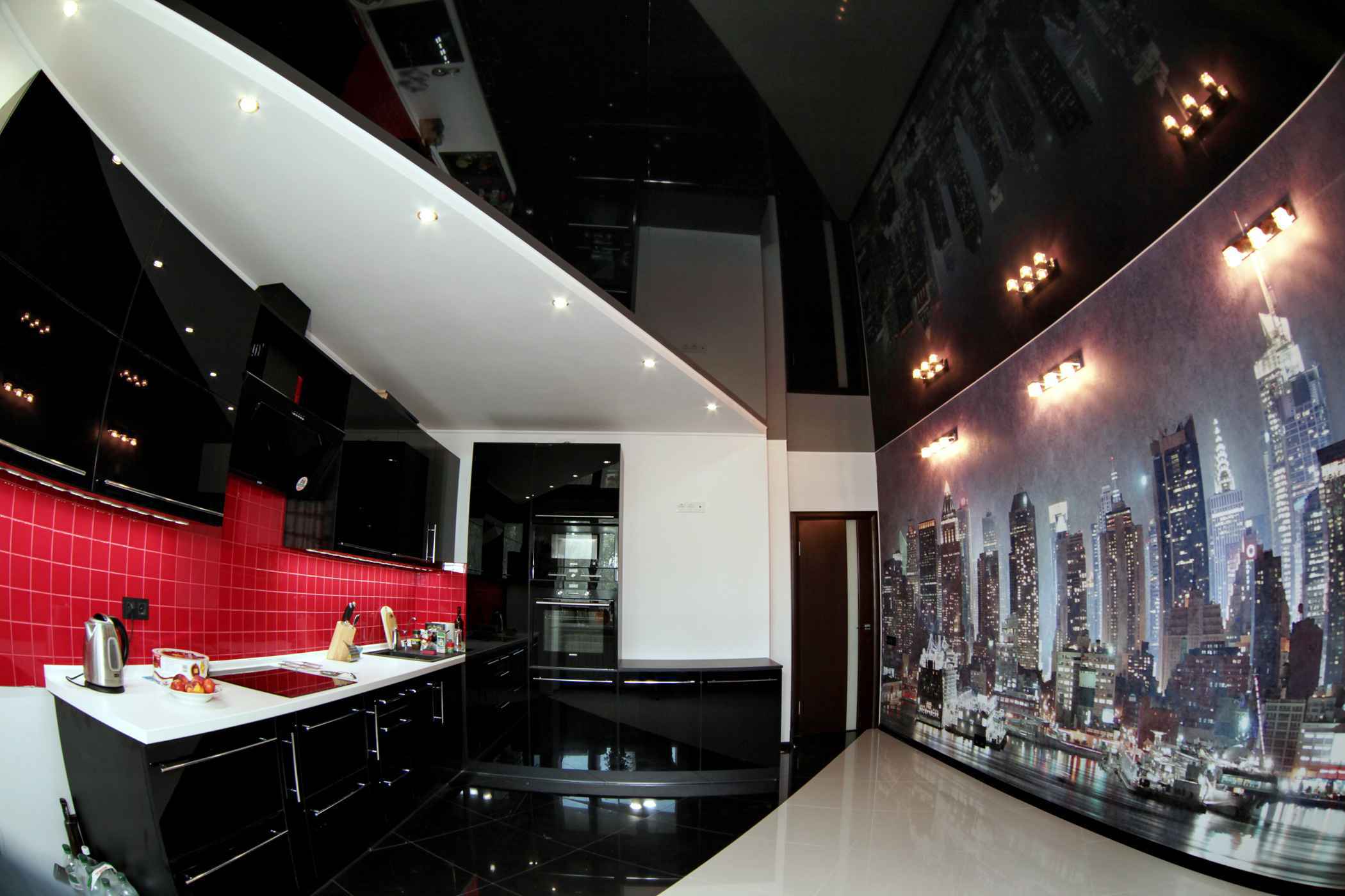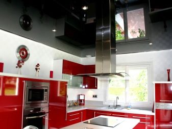 Those who prefer stretch ceilings receive not just an artistic work of art, but a practical finish on which water condensate does not accumulate. It is for the kitchen that this feature is important, since various communications take place indoors, for example, water supply. No matter what repairs you do, not a single tenant of an apartment building is insured against sewage emergency situations. Neighbors can “flood” at any time.