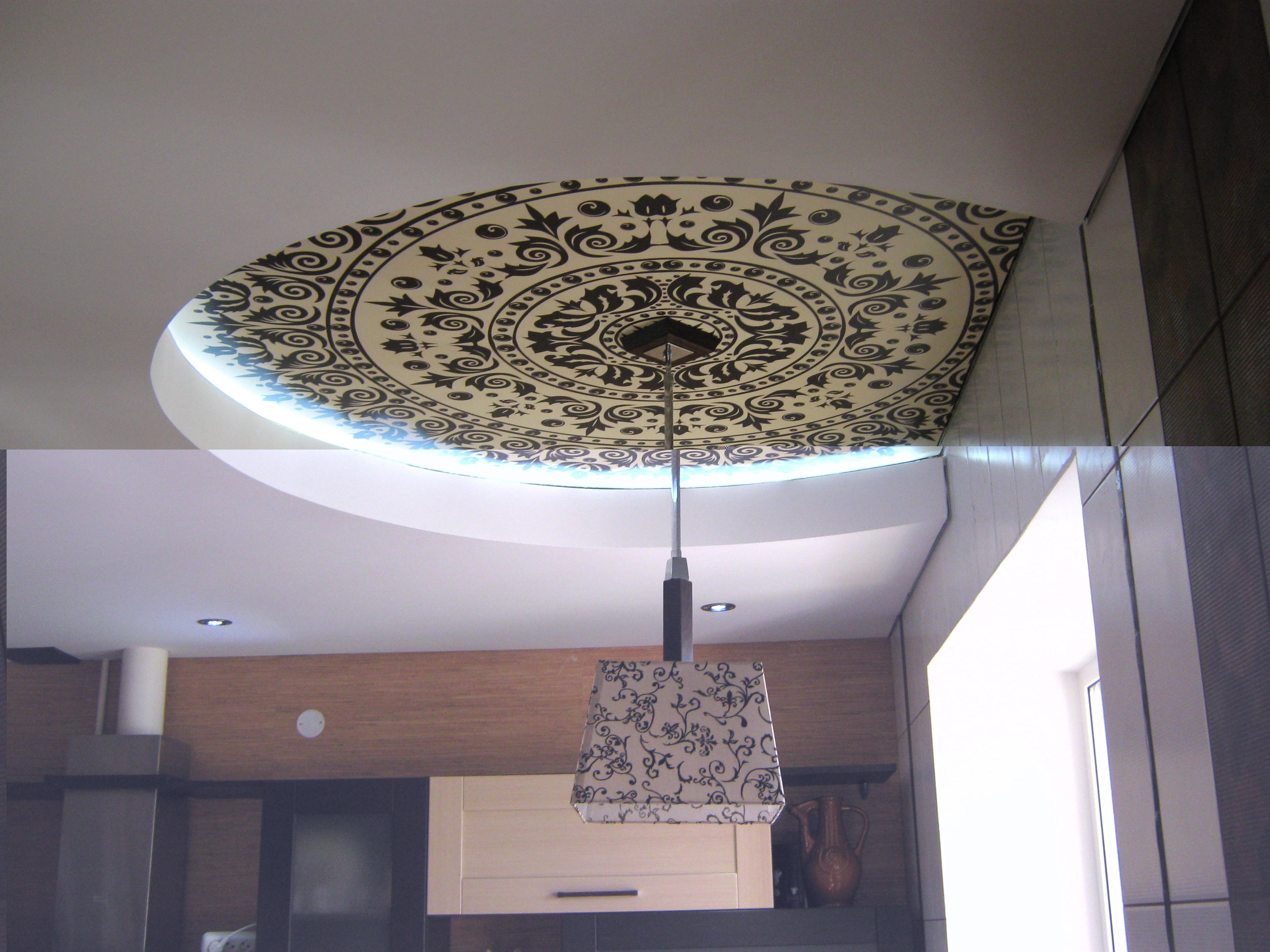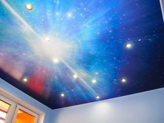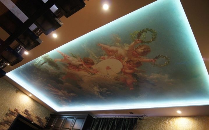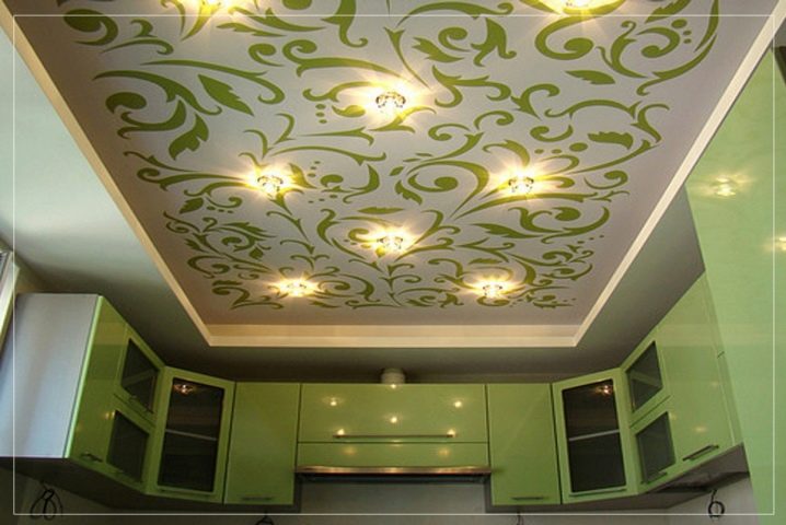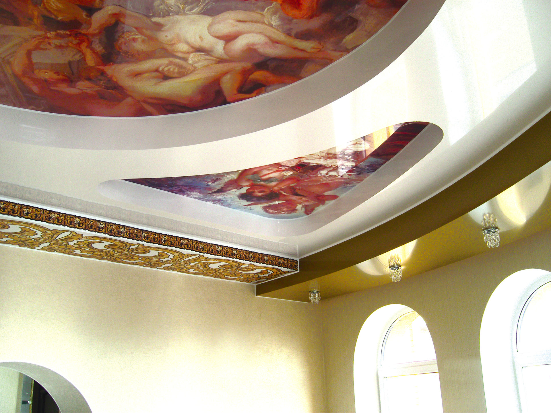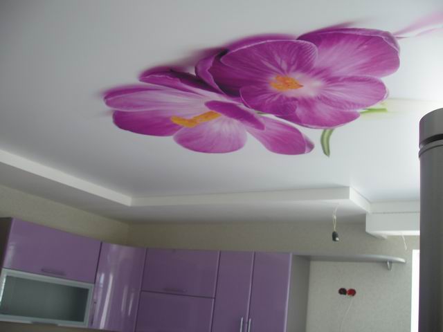 The ceiling surface with the pictures painted on it will look festively. The customer chooses the theme, prints and technique of the drawing: photo printing, acrylic or watercolor painting, mosaic, etc. For the kitchen fit still lifes, fruit compositions, the starry sky, painted angels or the seabed. If you are applying to art print, then you need to apply a large format printer with durable ink.
