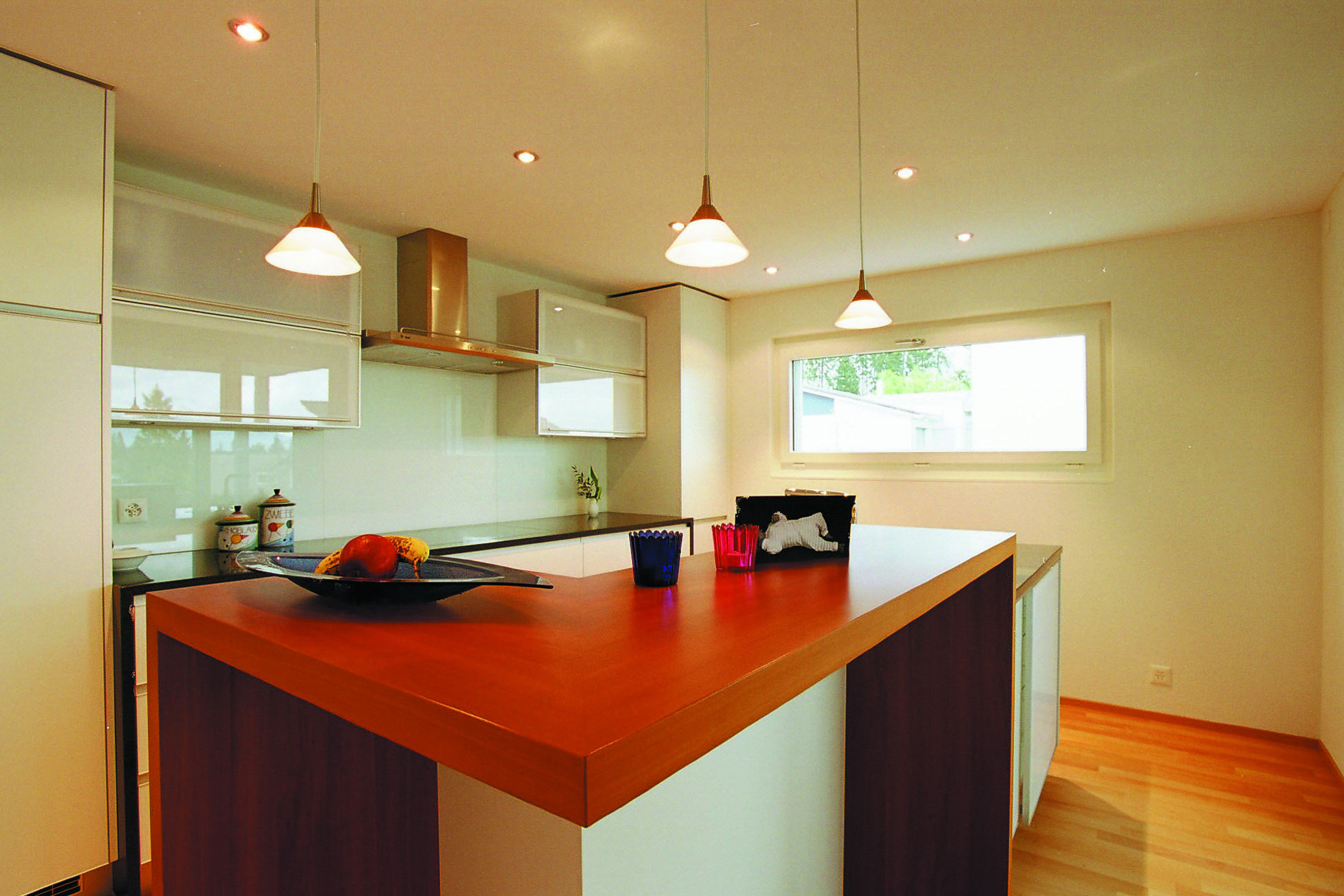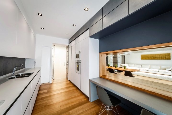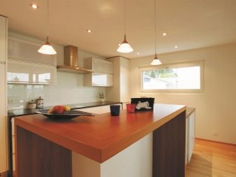 It is very important to think over high-quality lighting for each plot in the kitchen. Diffused, slightly dimmed light can only be in the lounge-zone. The remaining places should be lit as brightly as possible. To do this, use hanging structures, halogen lamps, led-strip or lamps.