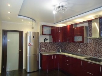 For spacious kitchen rooms with a significant height of ceilings, country mansions, an interesting performance will be a complex 2 or multi-level design. Competently combining colors, textures and lighting, you can achieve a stunning effect, set up a romantic, light or lounge-atmosphere in the house. Increasingly, compositions are determined in the kitchen in the form of a floating ceiling, a starry sky, and a cosmic vacuum. Dealing with the texture, pay special attention to satin, gloss, dullness and metallic effect. And with modern photo printing technology, you can apply any image, print, application, set the tone for the entire interior.