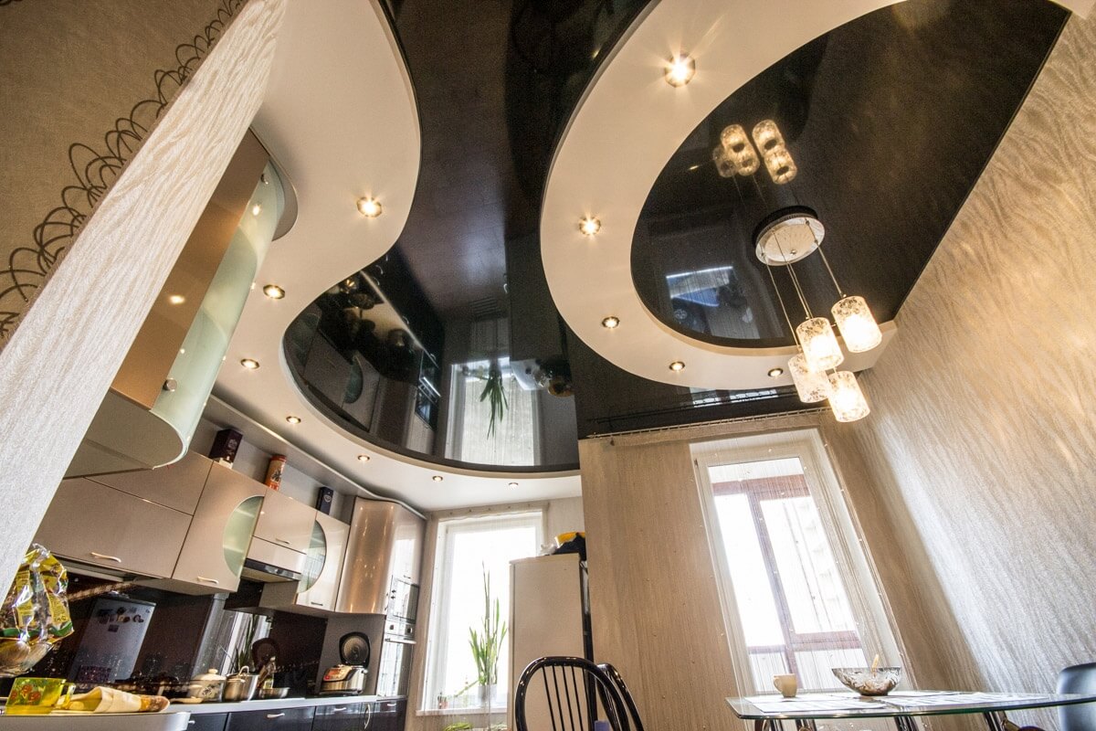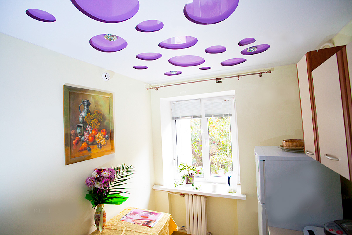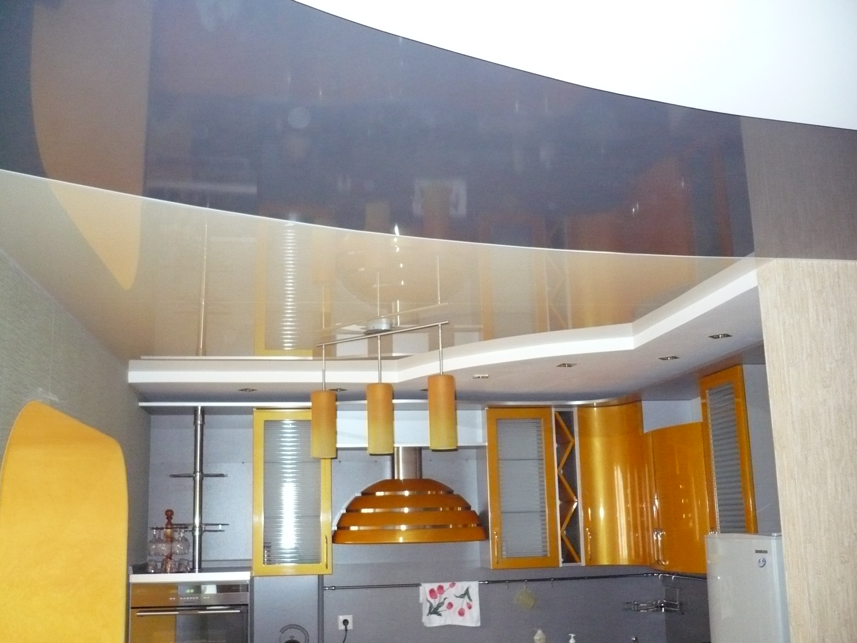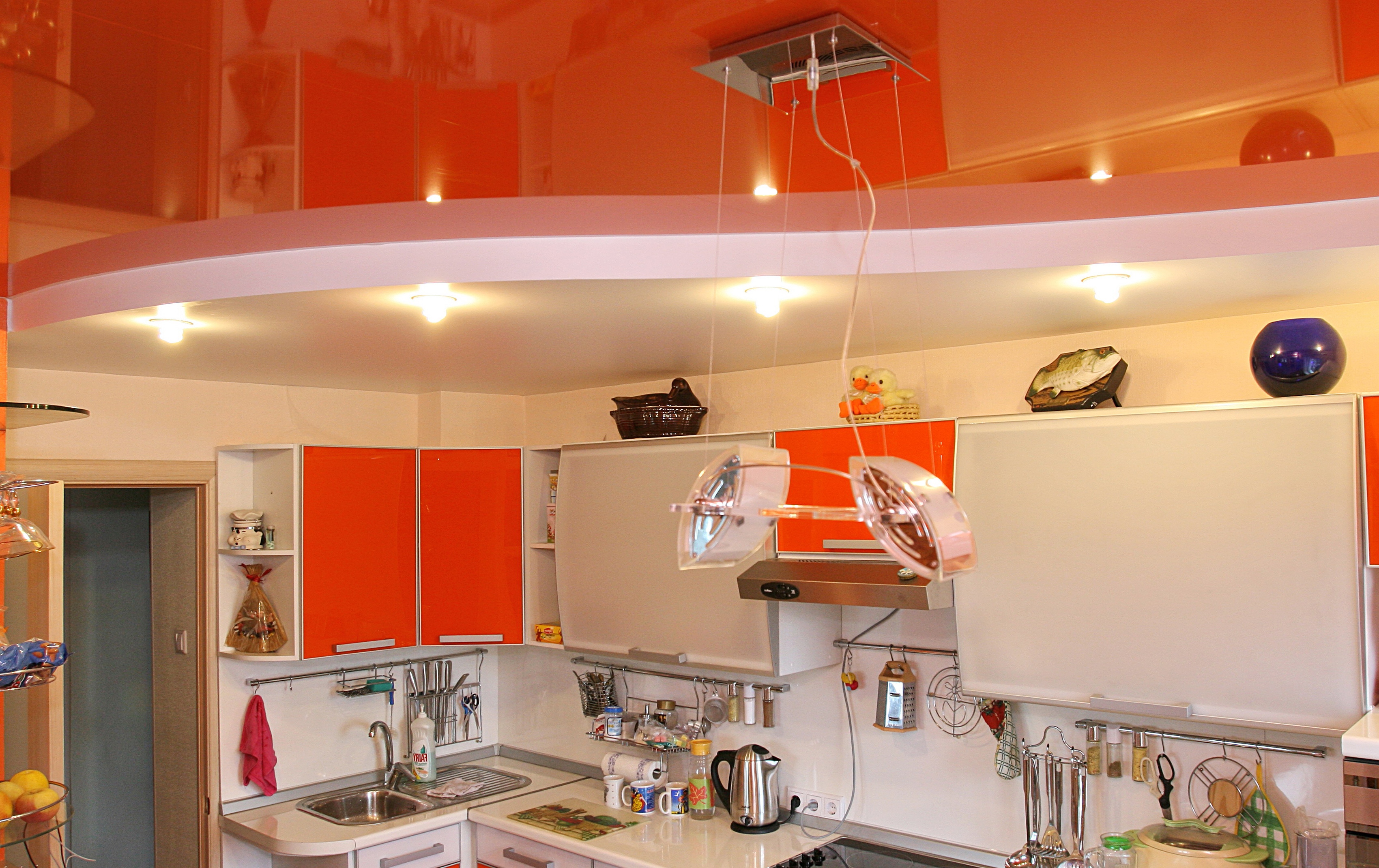 It is durable, perfectly keeps its shape, waterproof. It can be purchased for a small price, add a highlight to the kitchen interior, an attractive appearance. The modern market of building materials and a lot of design ideas offer multi-level models of ceilings with unusual effects.