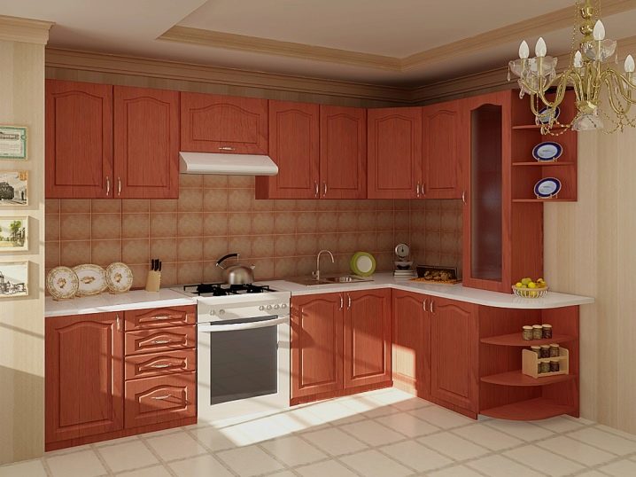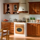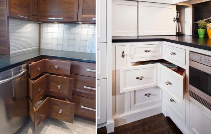 Externally, the cabinet will look very organic, without cluttering up the kitchen space. Most often, the corner cupboard is located closer to the work area and the sink, which gives the hostess additional convenience, because everything you need is now at hand. Less commonly, the corner cabinet is adapted for washing or hob surface. The “fillings” of corner cabinets can be varied: from elementary shelves to the carousel system. Hanging corner wardrobe can be made open and diversify the design with cute cozy things.