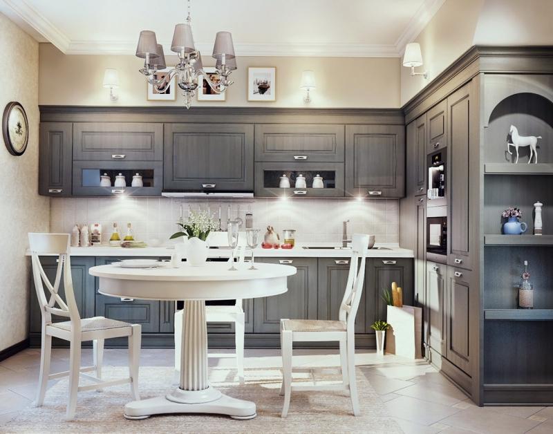 For a start, it is worth noting that even before buying cabinets and kitchen furniture in general, you need to decide how many interior items you need. For example, whether the dining area will be included, how it will be constructed: the letter “p” or at an angle along the perimeter of the walls.