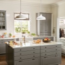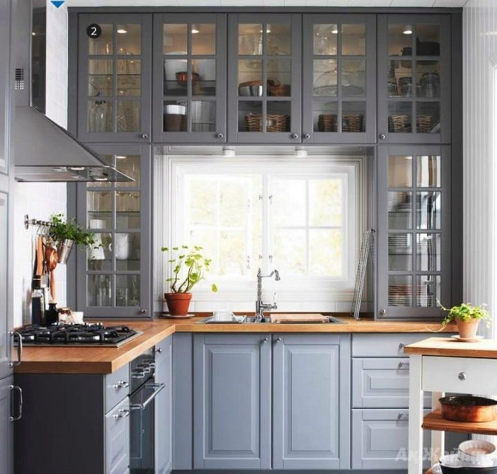 Cabinets in the form of cabinets from Ikea are in great demand.They fit perfectly into the interior and allow you to store various objects in them. The cabinet should correspond to the height of the lower cabinets so that the interior space is harmonious and coherent. This type of cabinet may have open shelves or be completely closed. In addition, you can choose a cabinet with doors or drawers.