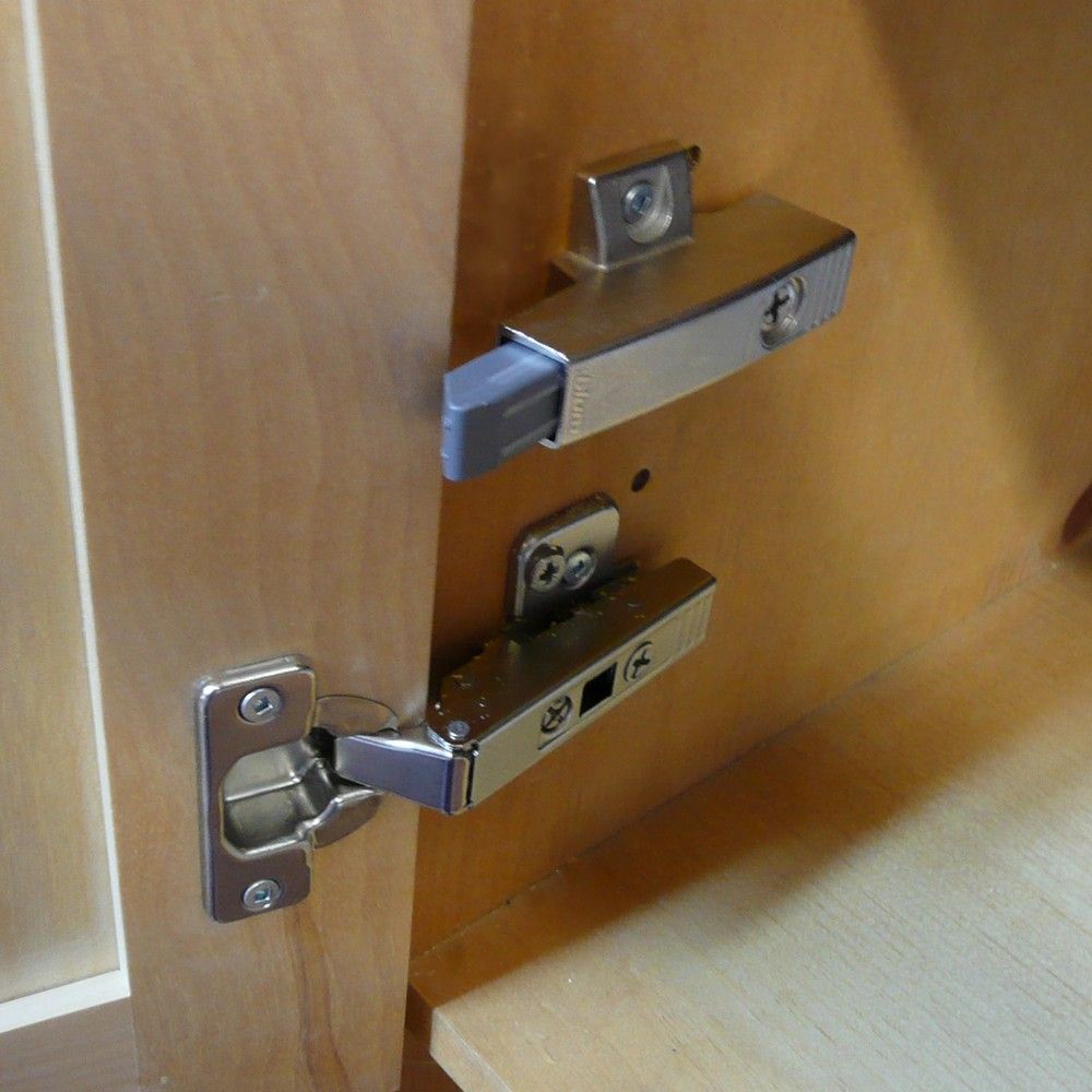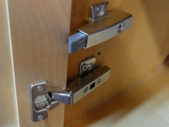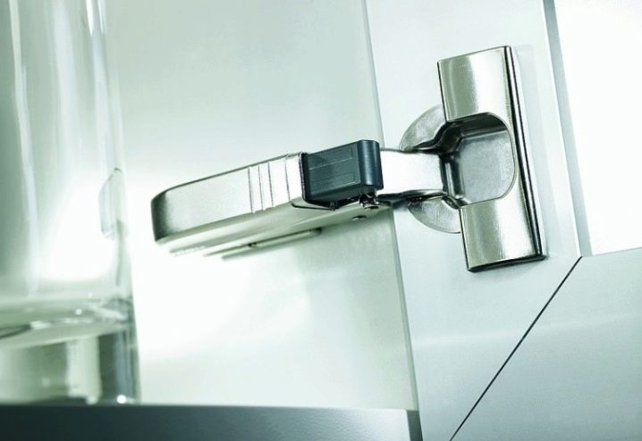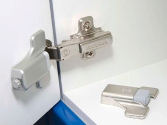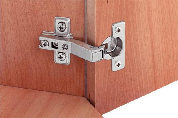 - Installed without using a drill. Such hinges are useful if the door is not thick enough to install cup hinges. The negative side in the installation of this hardware is that the adjustment of the position of the doors is possible only in one plane (up-down or farther-closer).