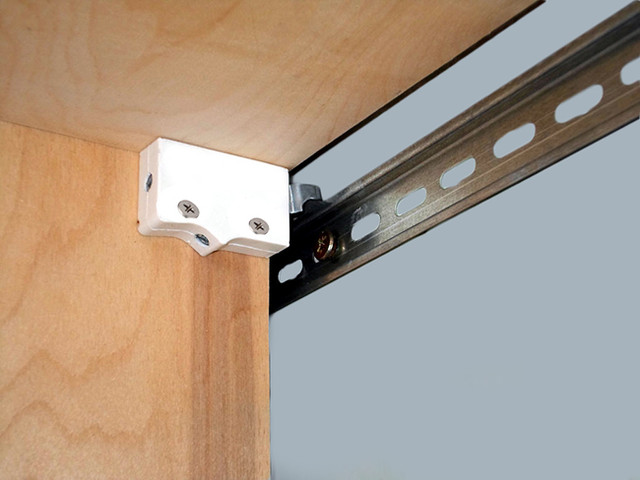 - Slide-on. This is a classic method of fastening, in which the fasteners and the rest of the fittings needed in the assembly of kitchen cabinets are placed in the opening of the plate on which the fixation is made.