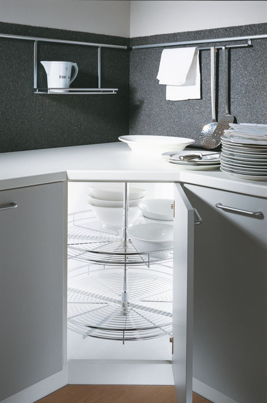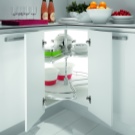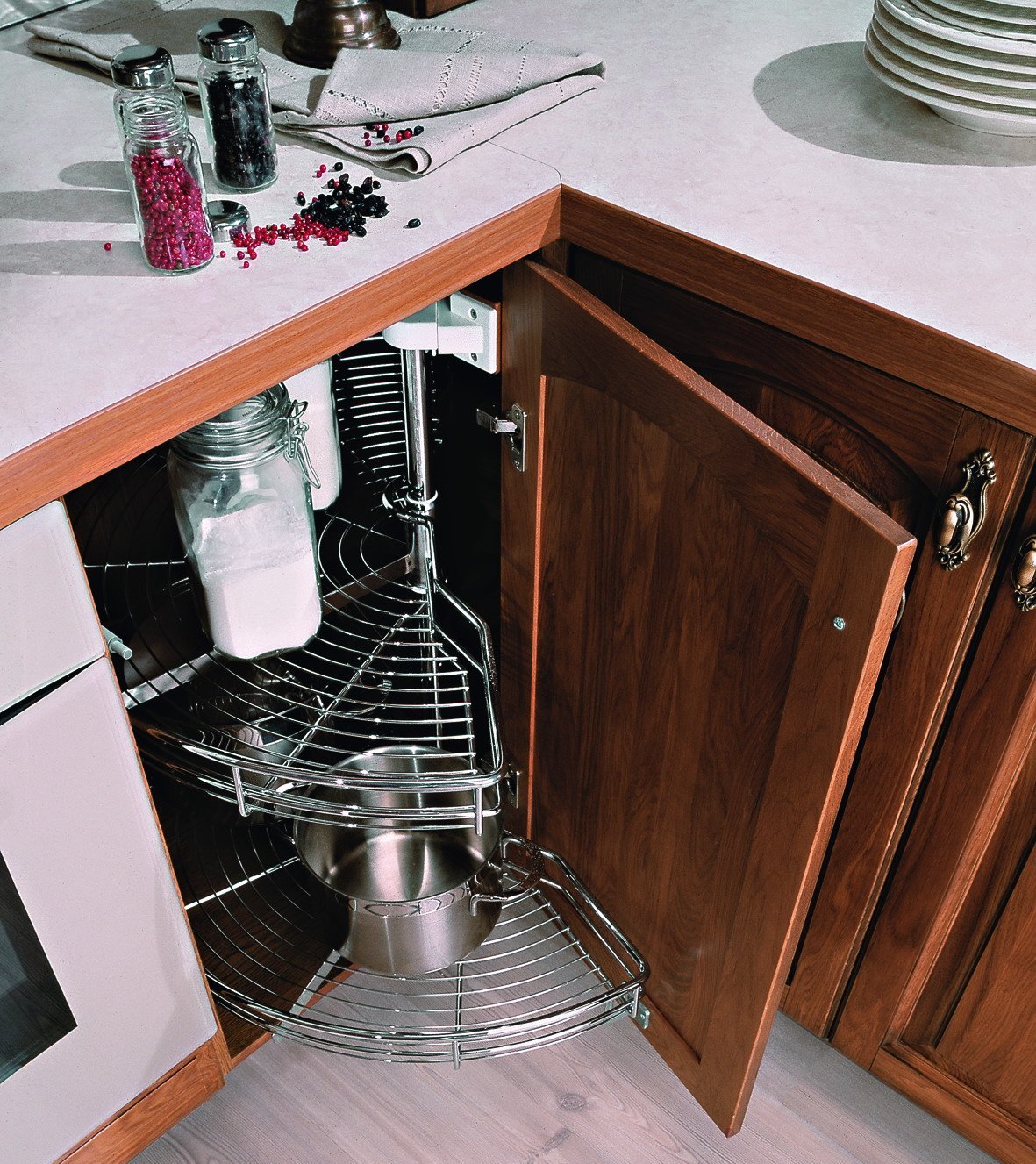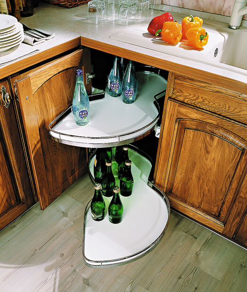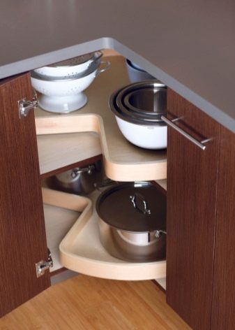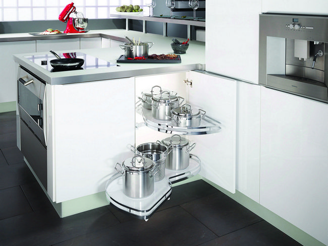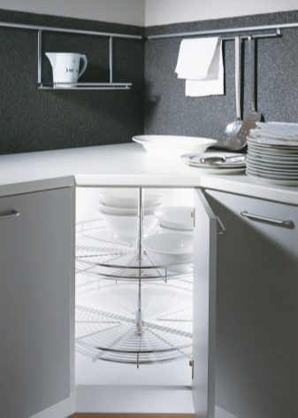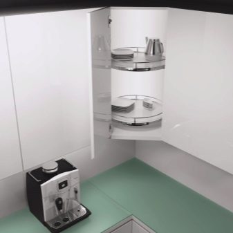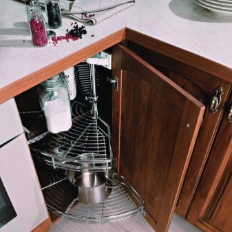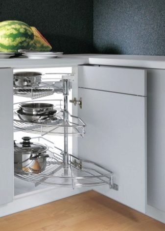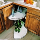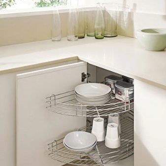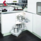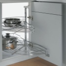 This wonderful device is a metal shelves attached to the frame inside the kitchen cabinet. These carousels are of two types. In the first model, when opening the cabinet door, the ball mechanism pushes out the semicircular shelves with dishes. In the second model, baskets are made in the shape of a circle and are completely placed inside the cabinet.