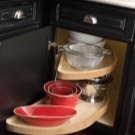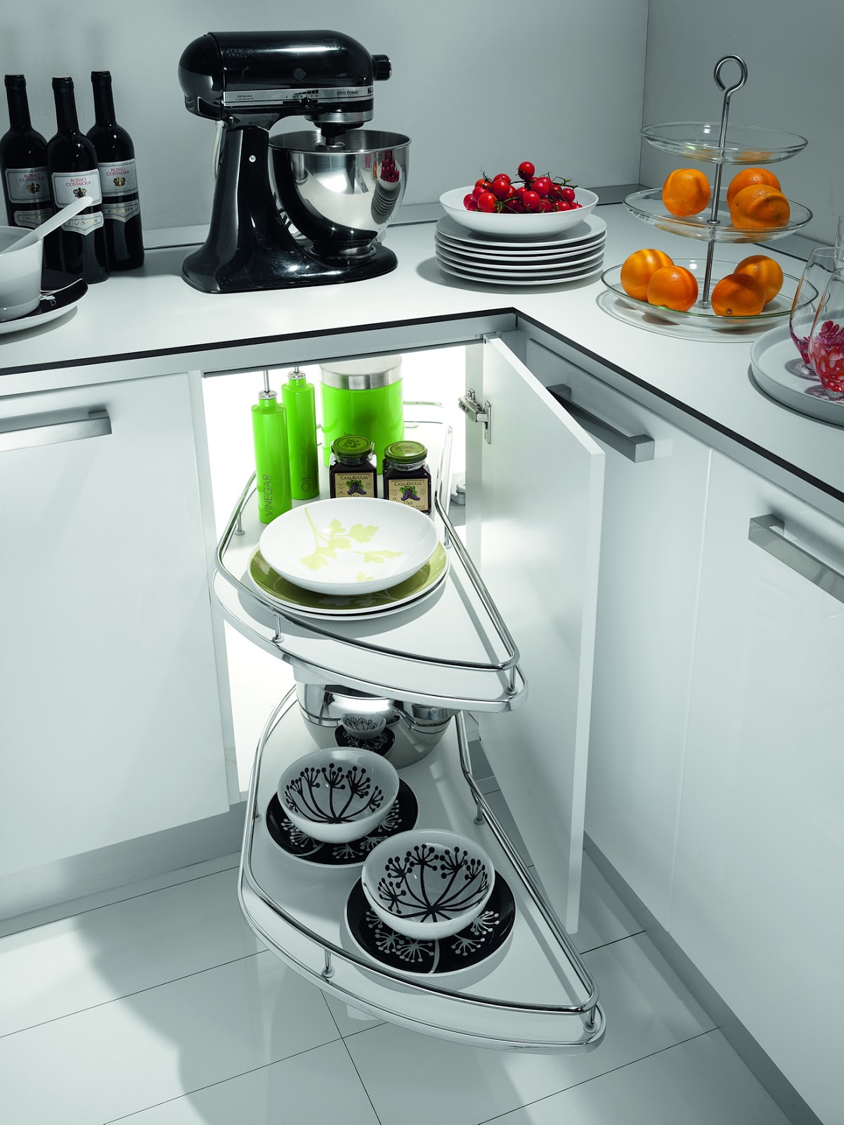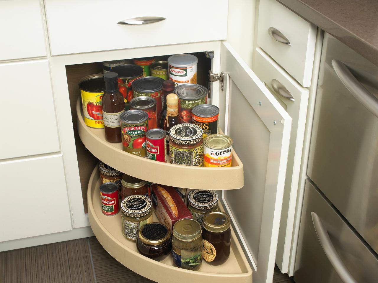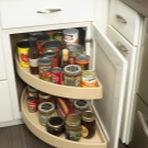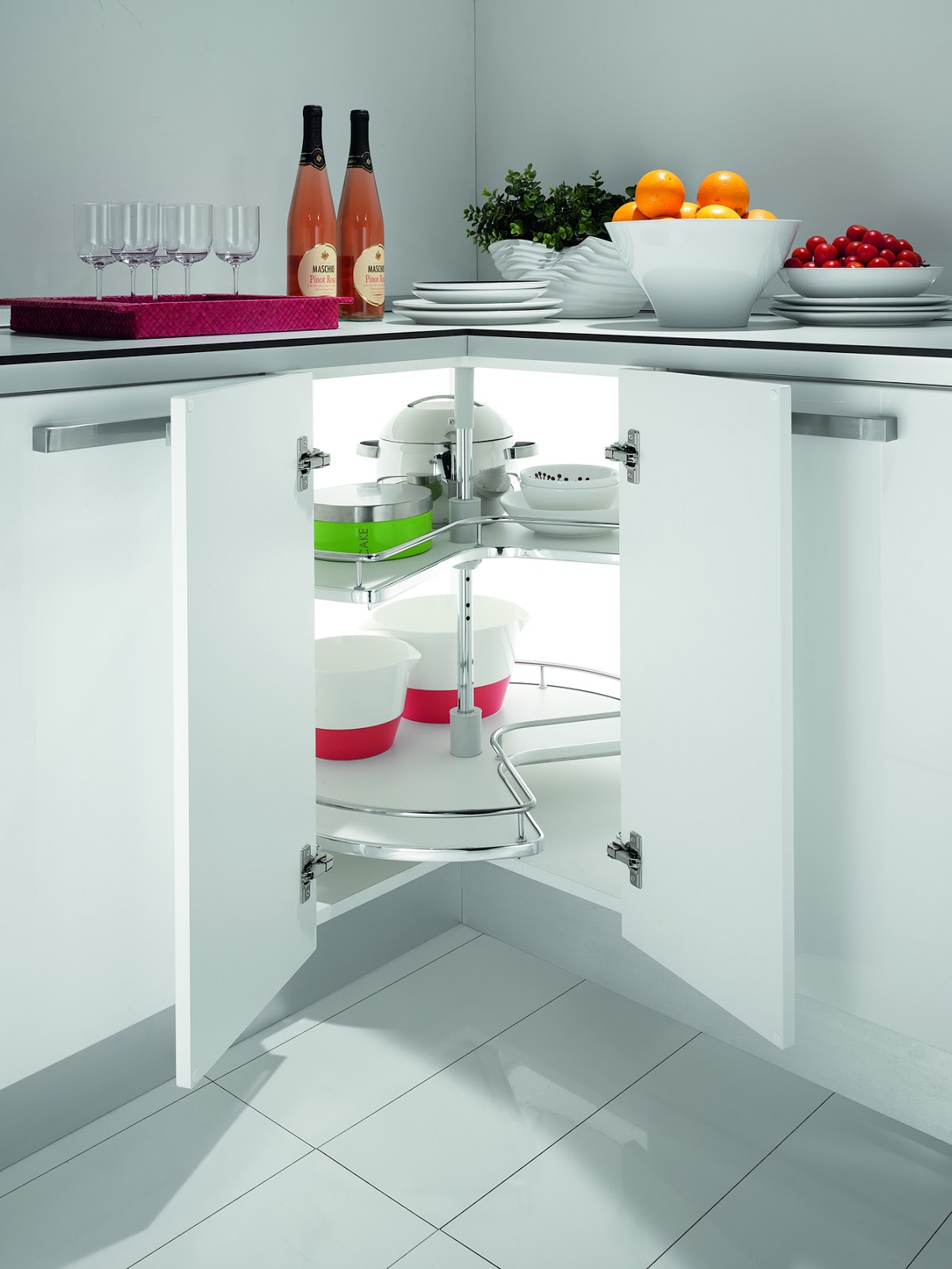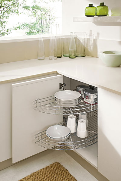 This wonderful device is a metal shelves attached to the frame inside the kitchen cabinet. These carousels are of two types. In the first model, when opening the cabinet door, the ball mechanism pushes out the semicircular shelves with dishes. In the second model, baskets are made in the shape of a circle and are completely placed inside the cabinet.