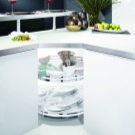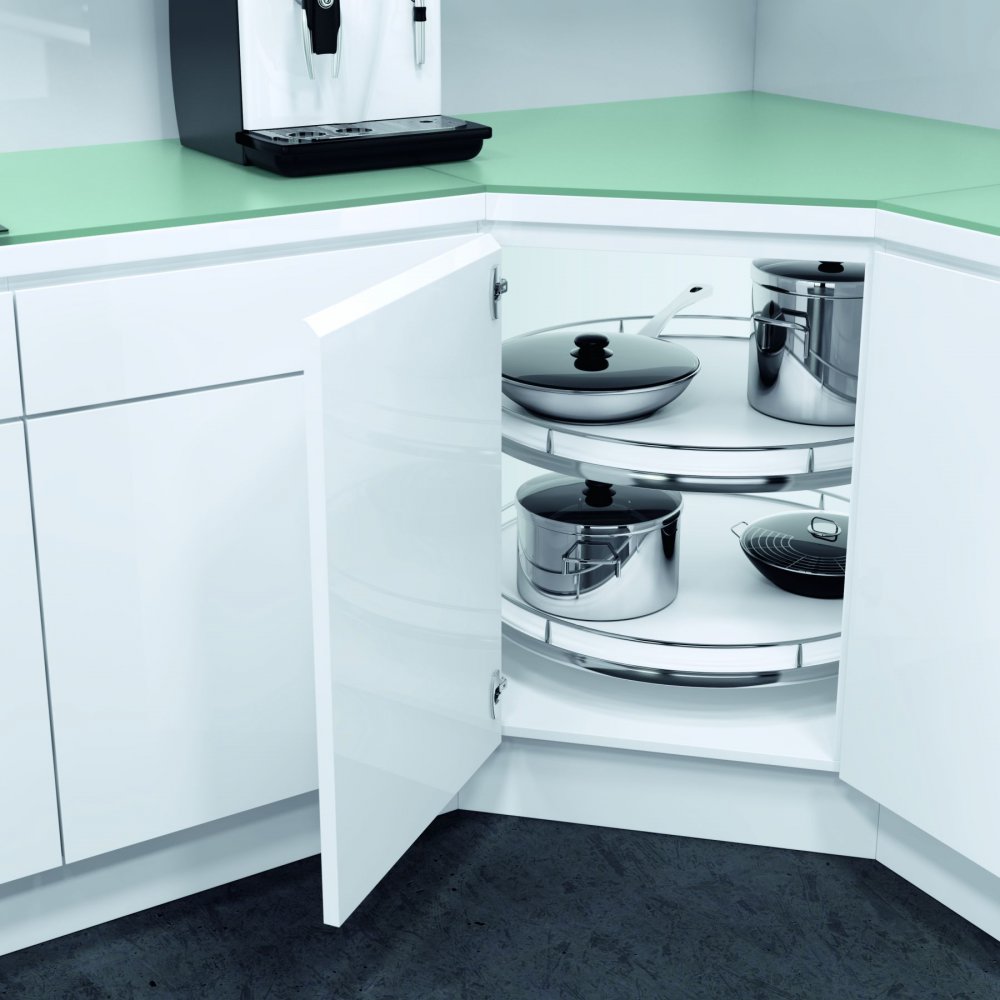 Semicircular shelves are usually a grid, and round - a plastic case with a metal rim at the edges. The diameter of the pads is from 700 mm to 1100, the height of the support column can be adjusted at its discretion in the range from 680 to 750 mm, which practically makes the design universal. Carousel can withstand weight up to 50 kg! This means that you can store on miracle shelves any non-square shaped dishes, ranging from cutlery and ending with cast iron pots and heavy pans.