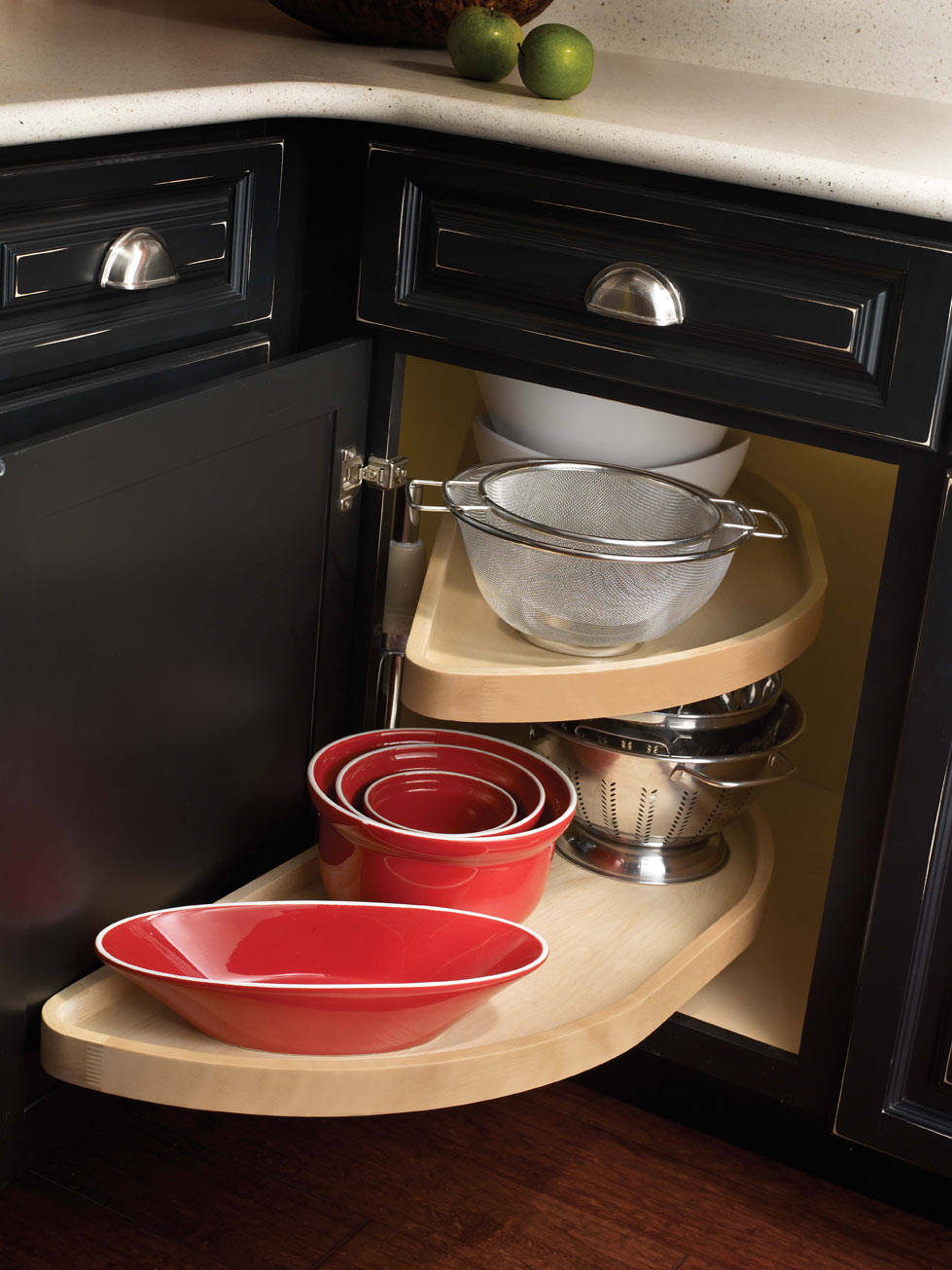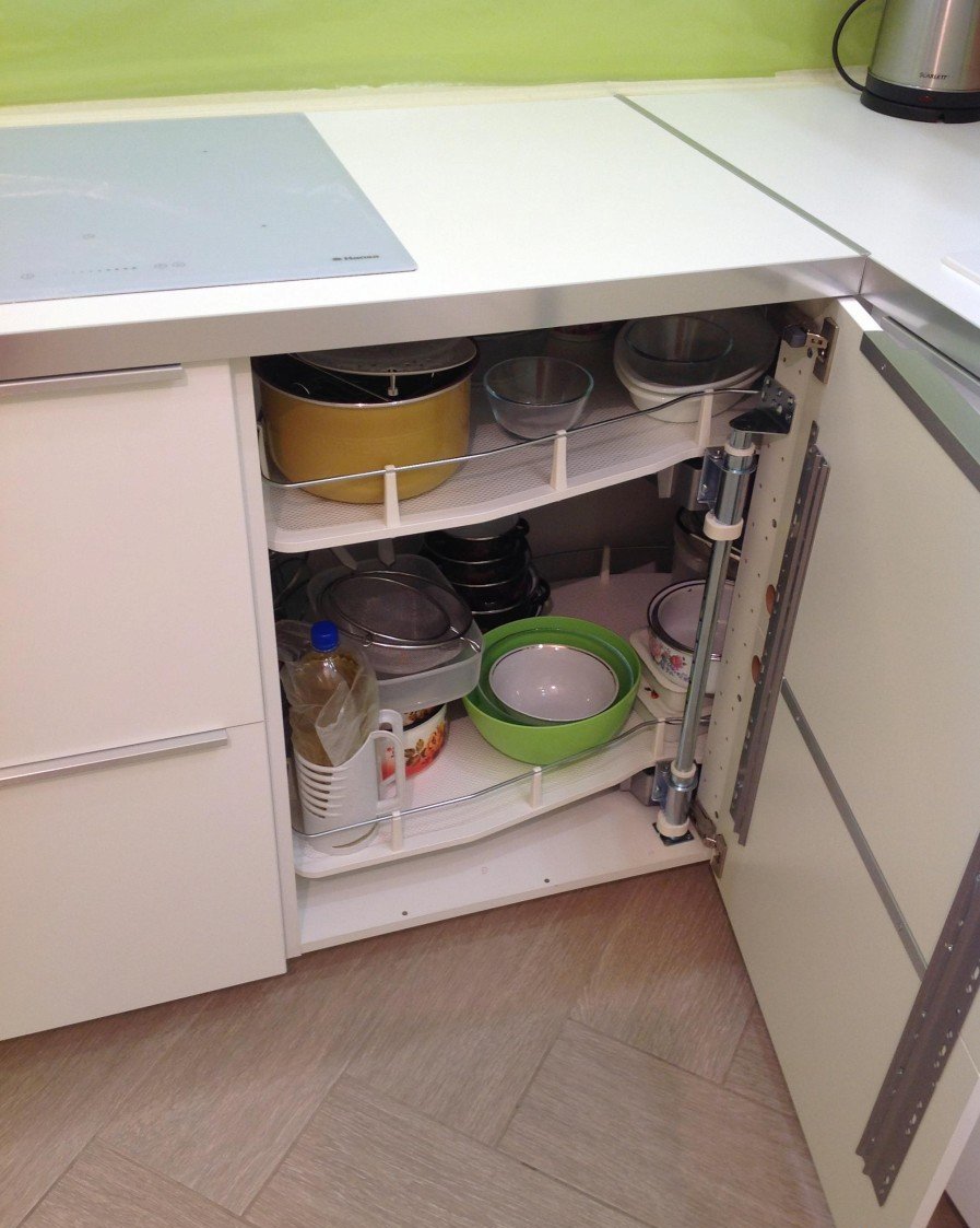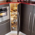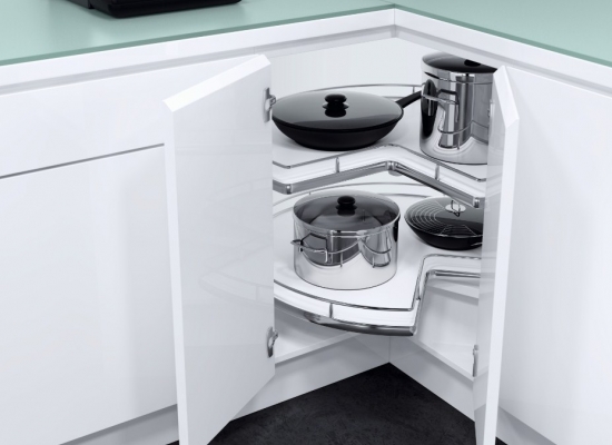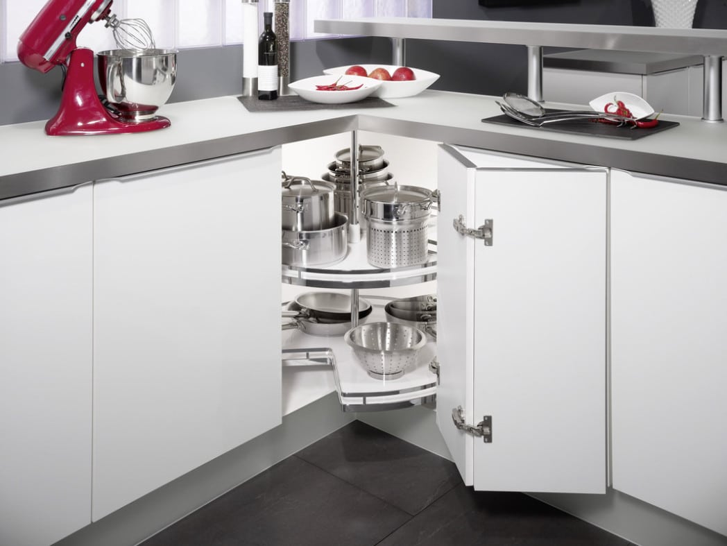 The most comfortable option is to place the carousel in the lower cabinets.to.Thus, all the utensils will be at hand, in the literal sense of the word. It will only be necessary to open the door of the kitchen cabinet and the shelves will “drive up” themselves, exposing the entire contents of the cabinet so that you don’t have to go inside the kitchen set to get the necessary object from there. But It is worth noting that the cabinet above which the sink is located is completely unsuitable for the carousel due to the presence of a drain, which will interfere with the functioning of the device.