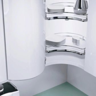 The radius of rotation of such structures varies depending on the capacity and location of the cabinet and can reach three hundred and sixty degrees. The shelves themselves are most often made of metal, sometimes of durable plastic, then they are chrome plated in several layers by electroplating - this serves as an ideal protection against corrosion.